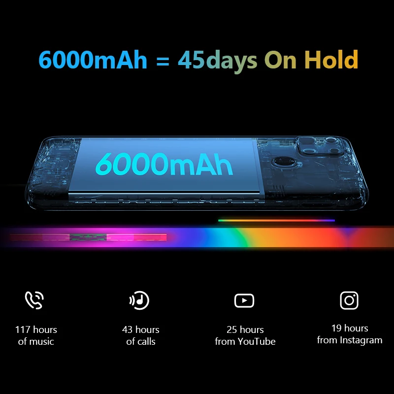 Realme 7i поставляется с самой большой батареей realme, которая когда-либо видела, с массивной емкостью 6000 мАч, которая даст вам до 45 дней в режиме ожидания. Избавьтесь от хлопот постоянно подзарядки вашего аккумулятора, смело играйте и пользуйтесь им свободно!