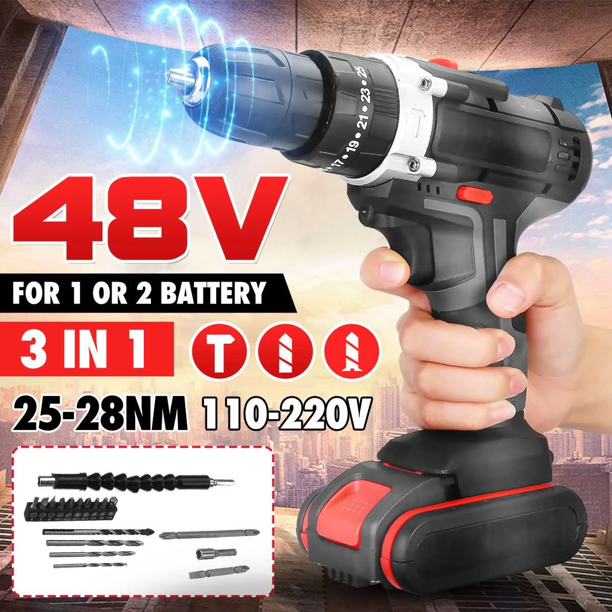 Электрическая дрель три функции с ударным 6000 мАч 48 в две зарядки или Одна зарядка