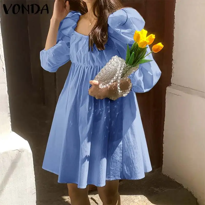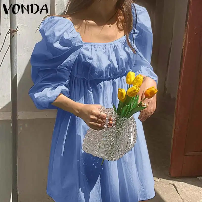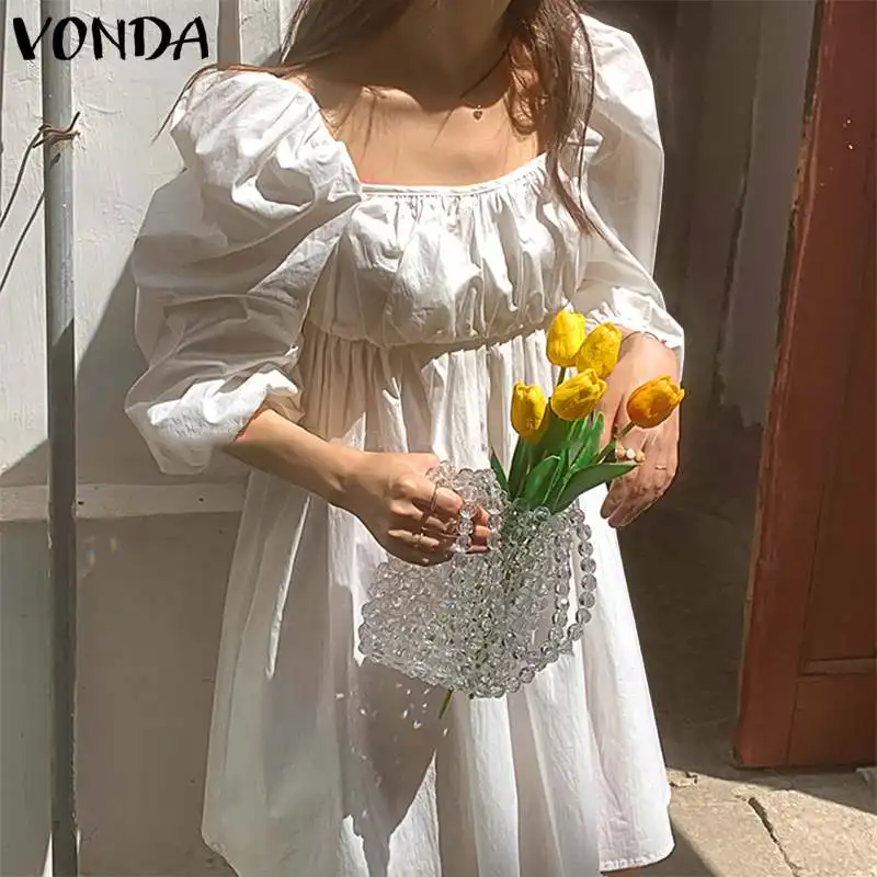Женское летнее платье S- Women'Summer 2021 VONDA, сексуальное вечервечерние мини-платье с пышными рукавами, богемный пляжный сарафан, Повседневное платье