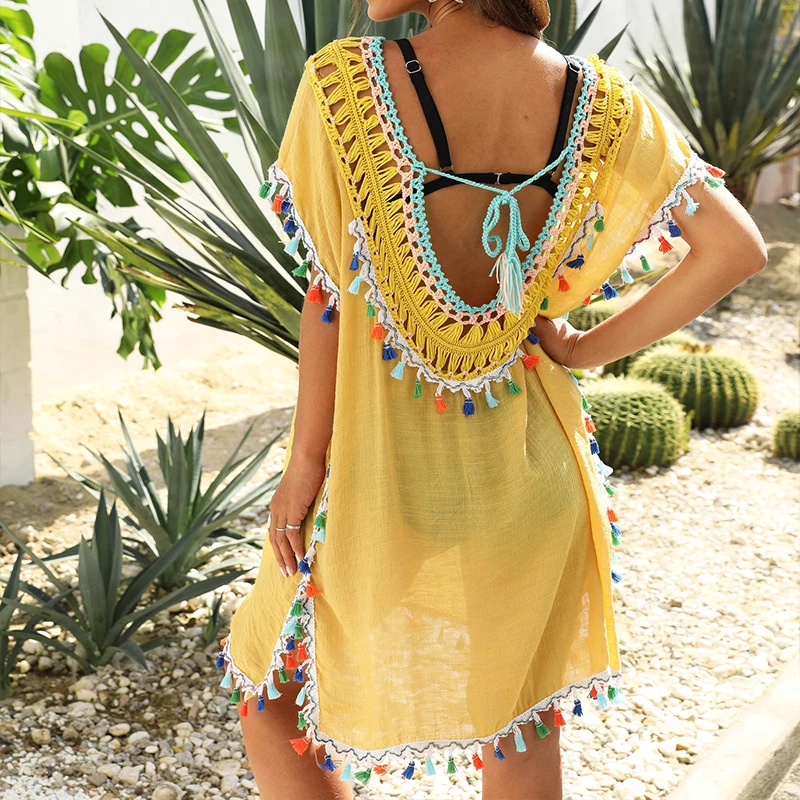пляжная туника 2021 Летний сексуальный свободный пляжный хлопковый топ с короткими рукавами и v-образным вырезом, вязаный крючком, пляжная одежда с открытой спиной туника женская пляжная