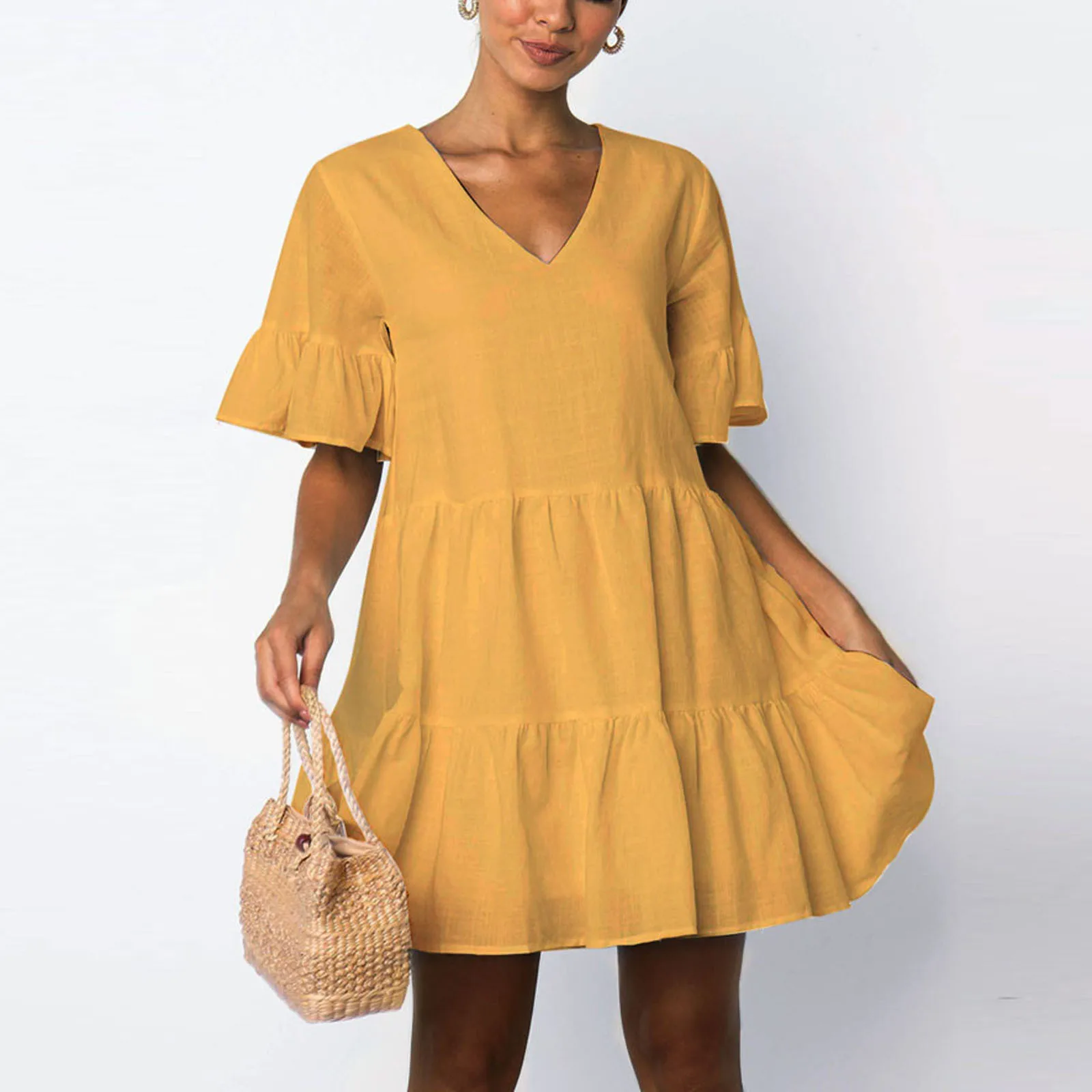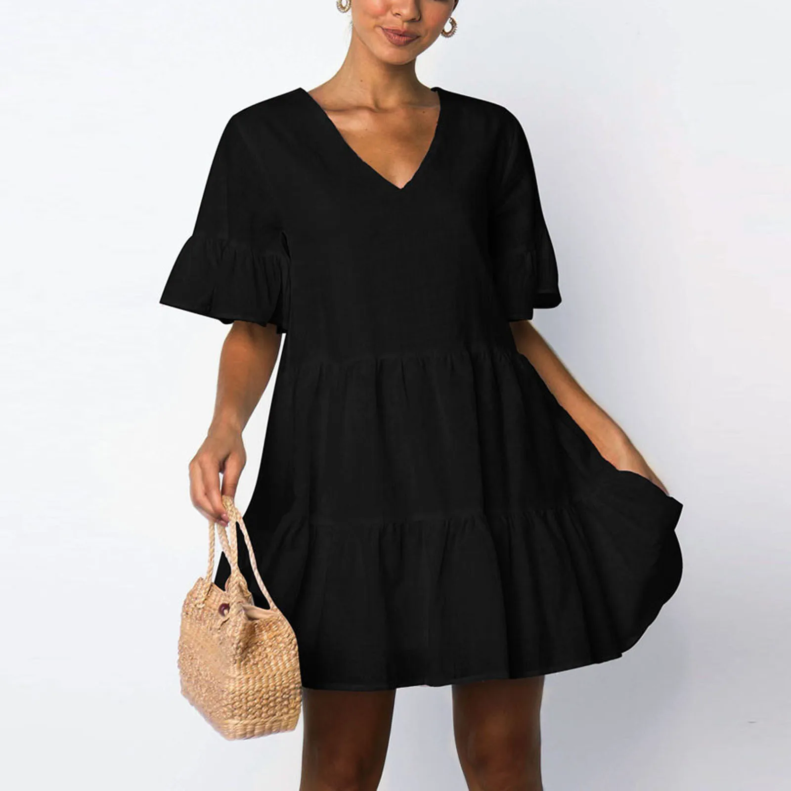 Женское платье размера плюс, повседневное однотонное платье с коротким рукавом и оборками, летнее Свободное платье с v-образным вырезом, Повседневное Платье Vestidos De MujerПожалуйста, проверьте таблицу размеров перед заказом. Если вы не уверены в размере, пожалуйста, отправьте нам сообщение.