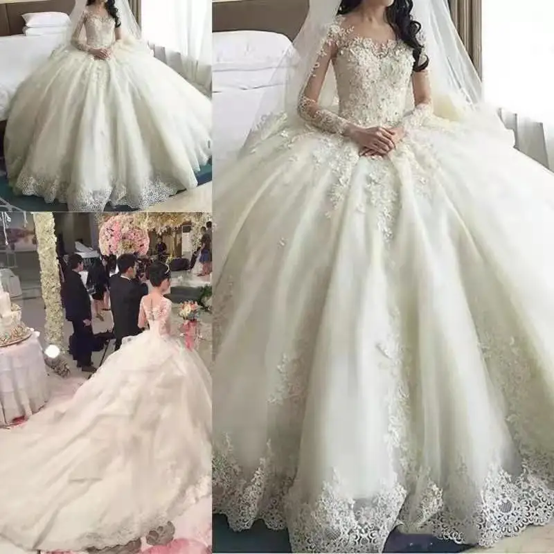 Роскошное бальное платье принцессы, кружевное свадебное платье невесты с длинным рукавом, украшенное камнями, свадебное платье для невесты с иллюзией, аппликацией сзади