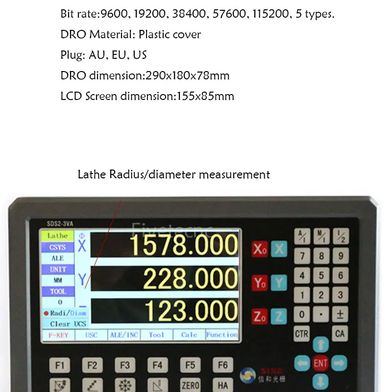 Бренд: SINO Модель: SDS2-3VA Вход напряжение: AC80V-240V В переменного тока, 50/60 Гц Мощность: 15 Вт Входной сигнал: TTL или RS422 Разрешение может быть комплект: 0,05/0,1/0,2/0,5/2/5/10/20μm Тип установки оси: линейная шкала или роторный кодировщик Экран защиты время: 30/60/90/120 минут или закрыть Битрейт: 9600, 19200, 38400, 57600, 115200, 5 типов. DRO Материал: пластиковая крышка Вилка: AU, EU, US DRO Размеры: 290x180x78мм Размер ЖК-экрана: 155x85мм