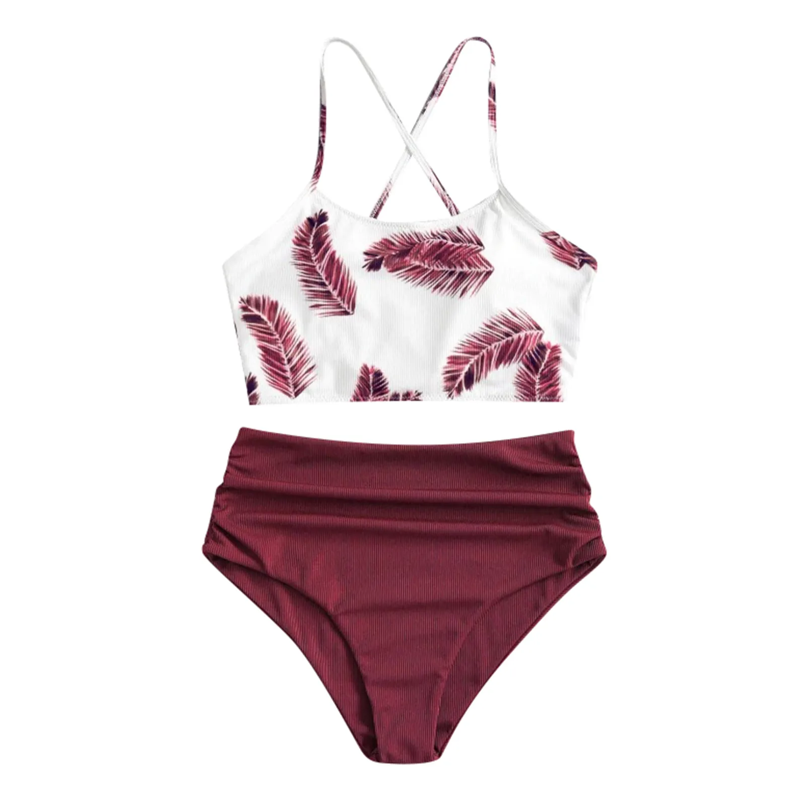 Женский раздельный купальник из двух частей с принтом листьев, купальный костюм размера плюс