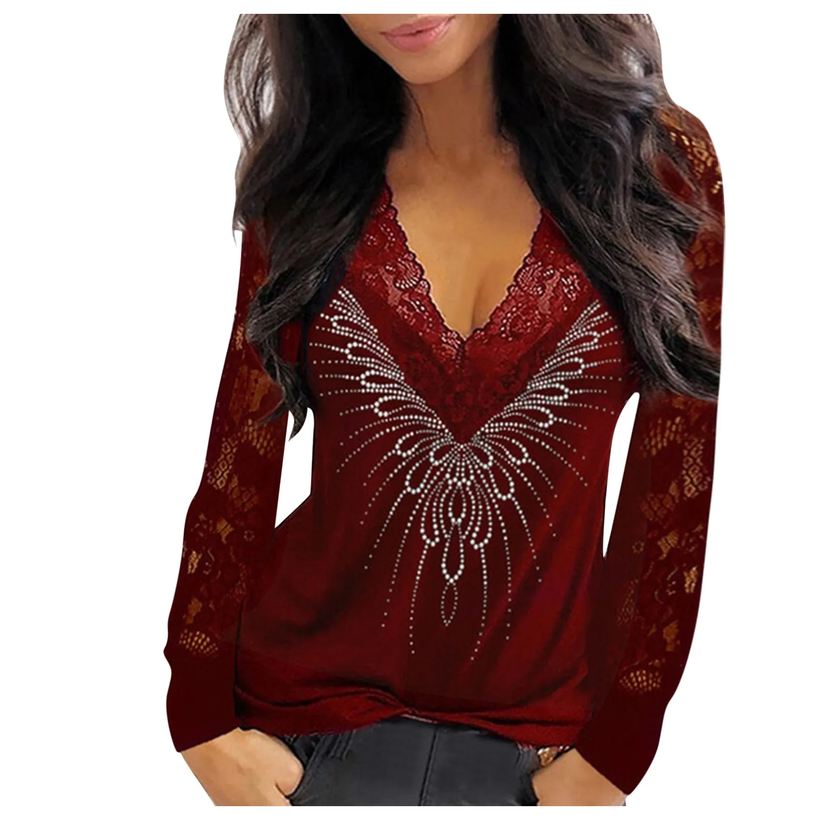Женская Кружевная футболка с V-образным вырезом и длинным рукавом