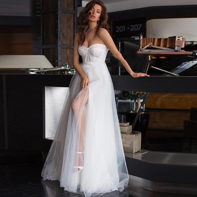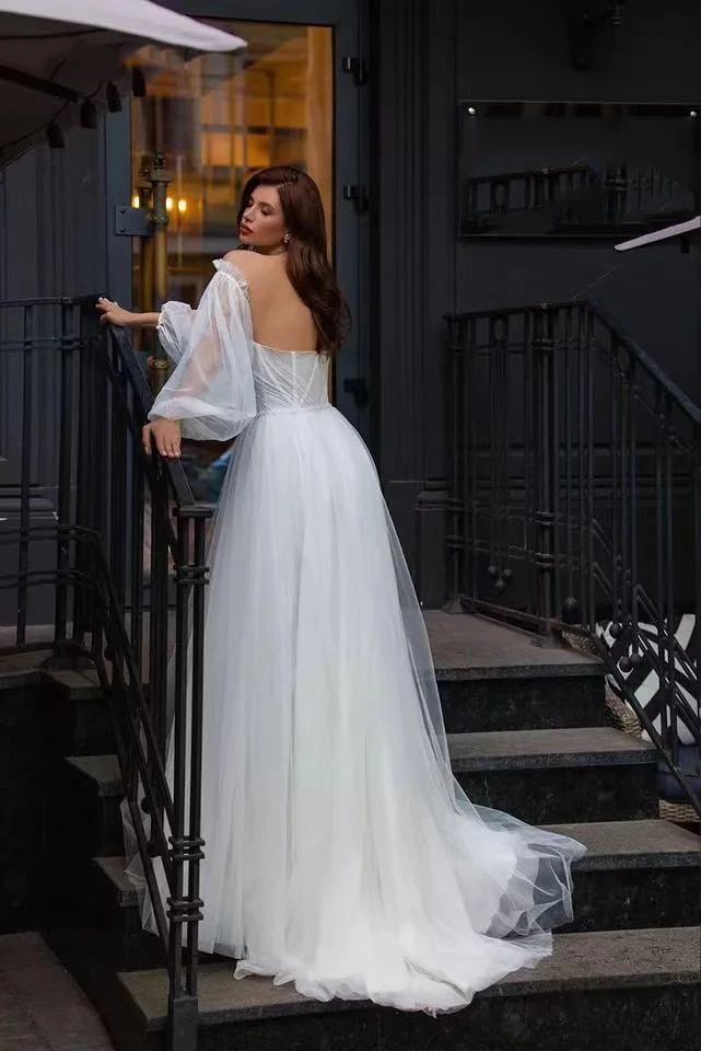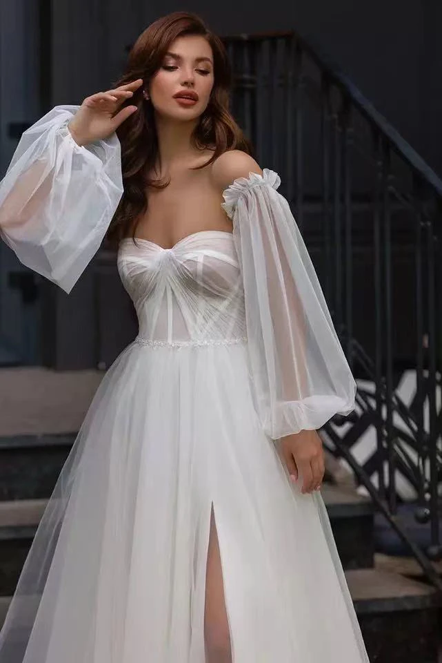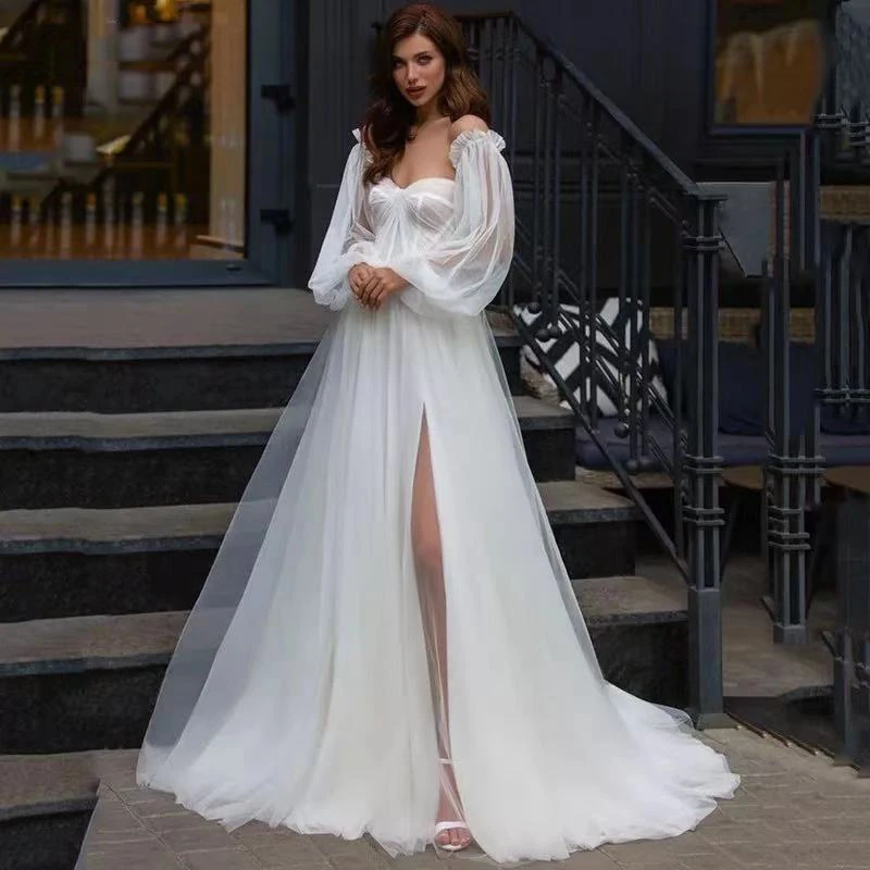 Свадебные платья с Боковым Разрезом, свадебное платье в стиле бохо со съемными пышными рукавами, пляжные свадебные платья а-силуэта, платье для невесты с сердечком