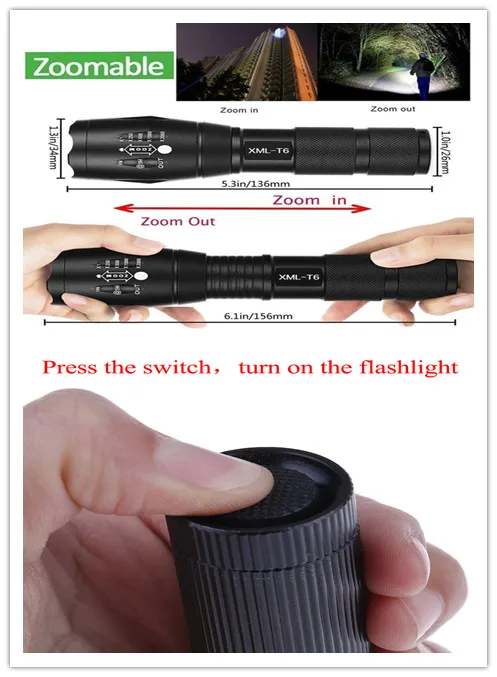 AОсобенности:Яркий и ослепляющий эффект.Противоскользящий дизайн, вы можете иметь удобный захват.Тактическая головка, скрученный ударный ободок для усиленной самозащитыУдобная переноска с ручным ремешком.Спецификация:Тип эмиттера: Cree T6Цвет ободка: черныйМатериал корпуса: высококачественный алюминиевый сплавРежим: высокий/средний/низкий/Стробоскоп/SOSБатарея: 3xAAA Батарея или 1x18650 3,7 V Батарея (Батарея не входит в комплект поставки).Тип переключателя: НажмитеРасположение переключателя: Хвостовая крышкаЯркость: около 10000LMРазмер (головка Lx D x корпус D): 5,31x1,37x1,1 дюймов/13.5x3.5x2.8cmПодходит для охоты, велоспорта, альпинизма, кемпинга и активного отдыха, ежедневного использования и т. д.Посылка:1x Cree XML T6 светодиодный фонарик