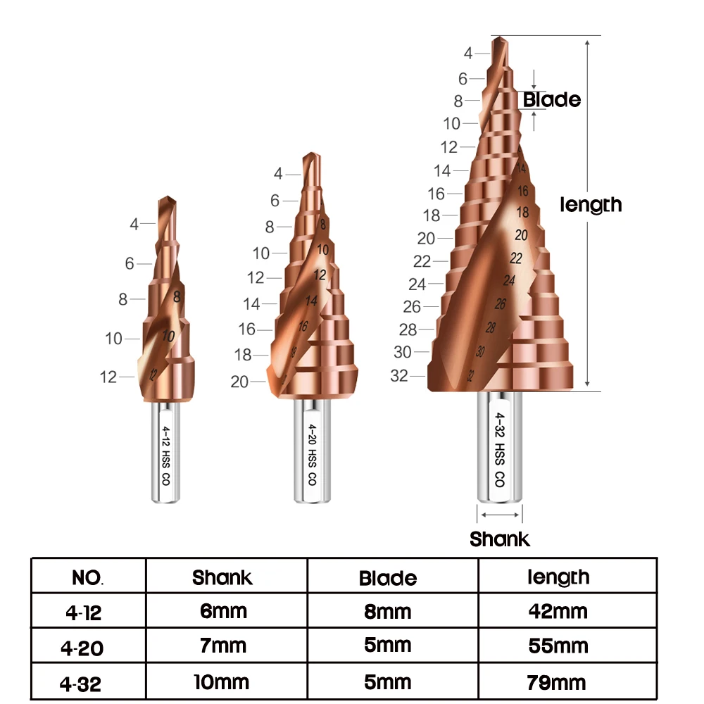 4-122032 мм ступенчатое сверло из быстрорежущей стали CO M35 TiCN с покрытием спиральноепрямое паз для древесины металла сверло для отверстий конусное сверло