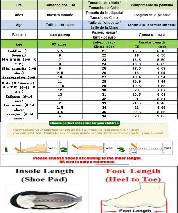 Перед размещением заказа проверьте длину стельки обуви вашего ребенка. Мы отправляем обувь по длине стельки.