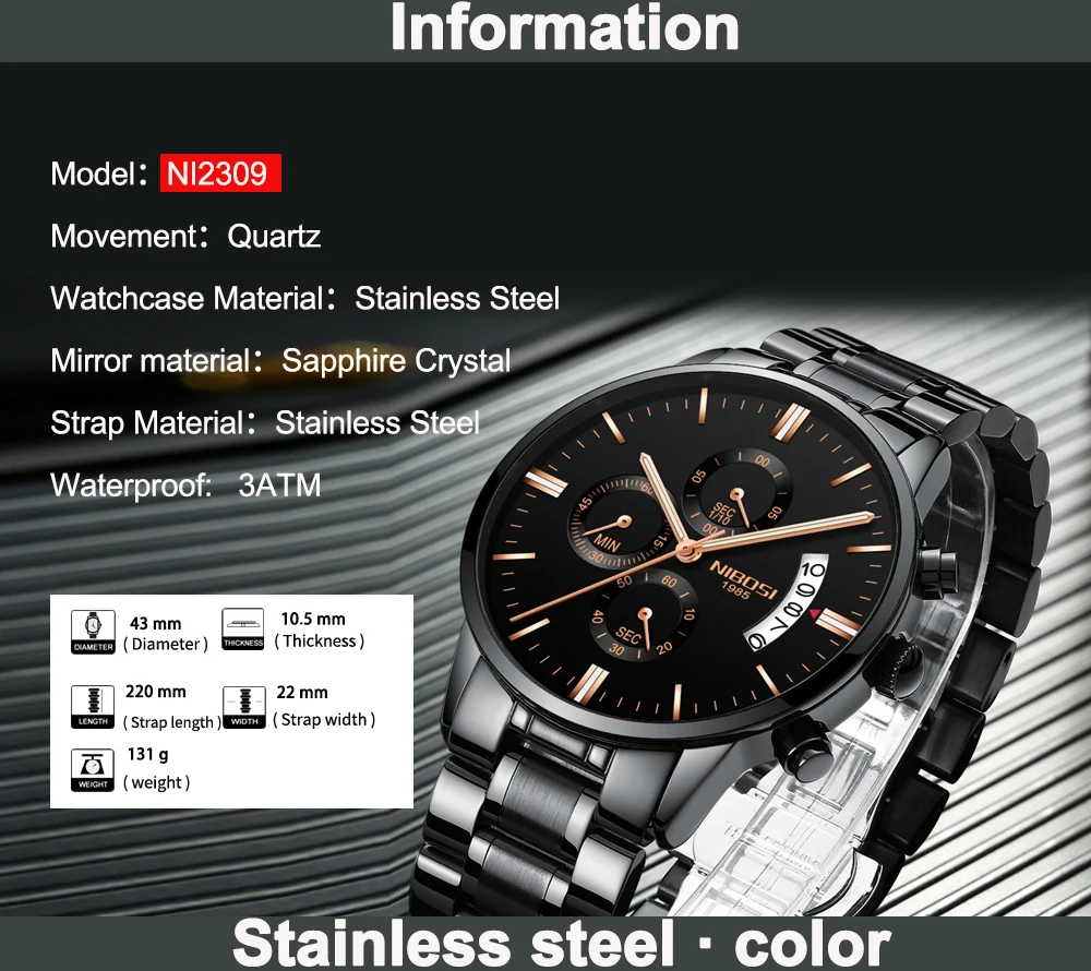 Мужские деловые часы NIBOSI Montres, черные, розовые, золотые роско...