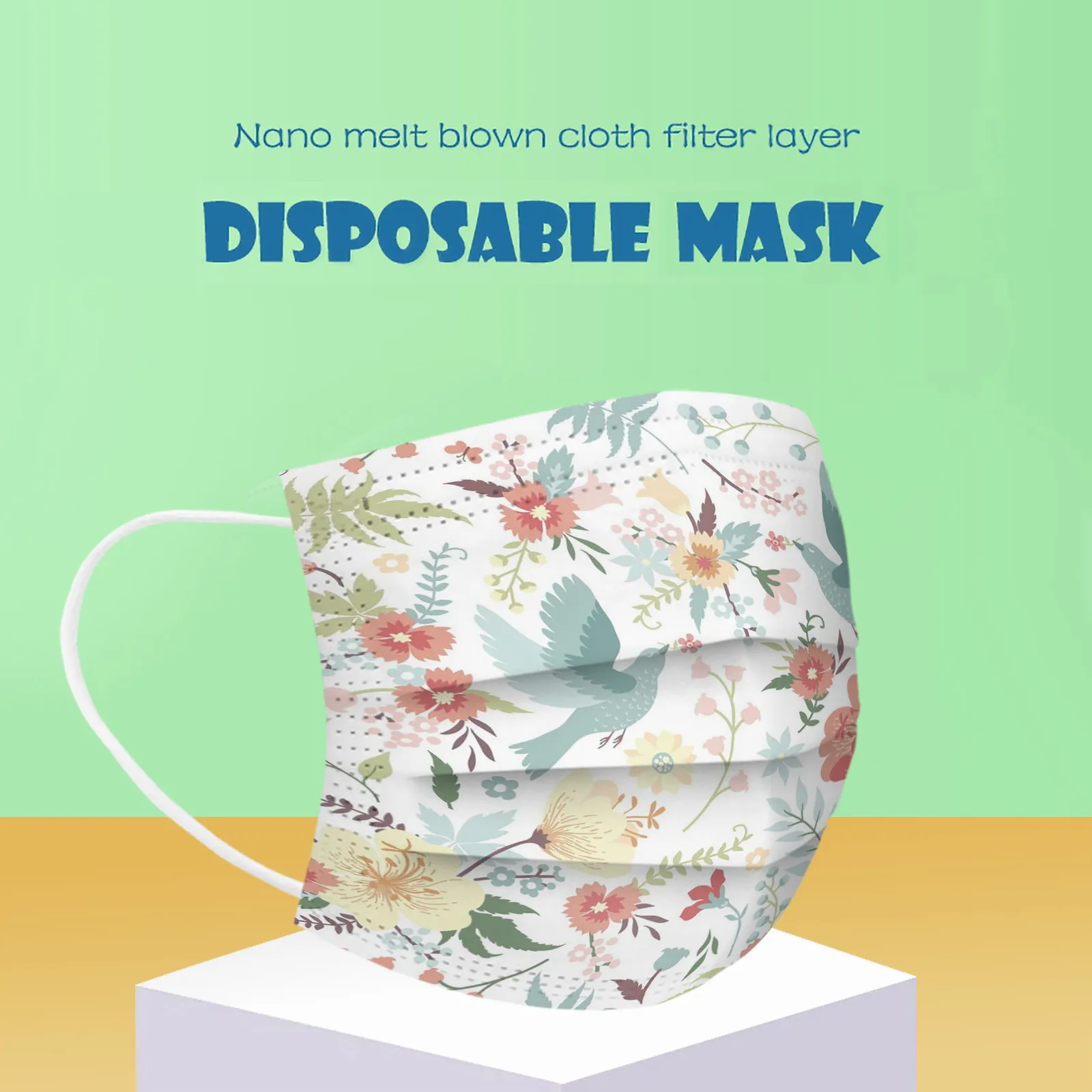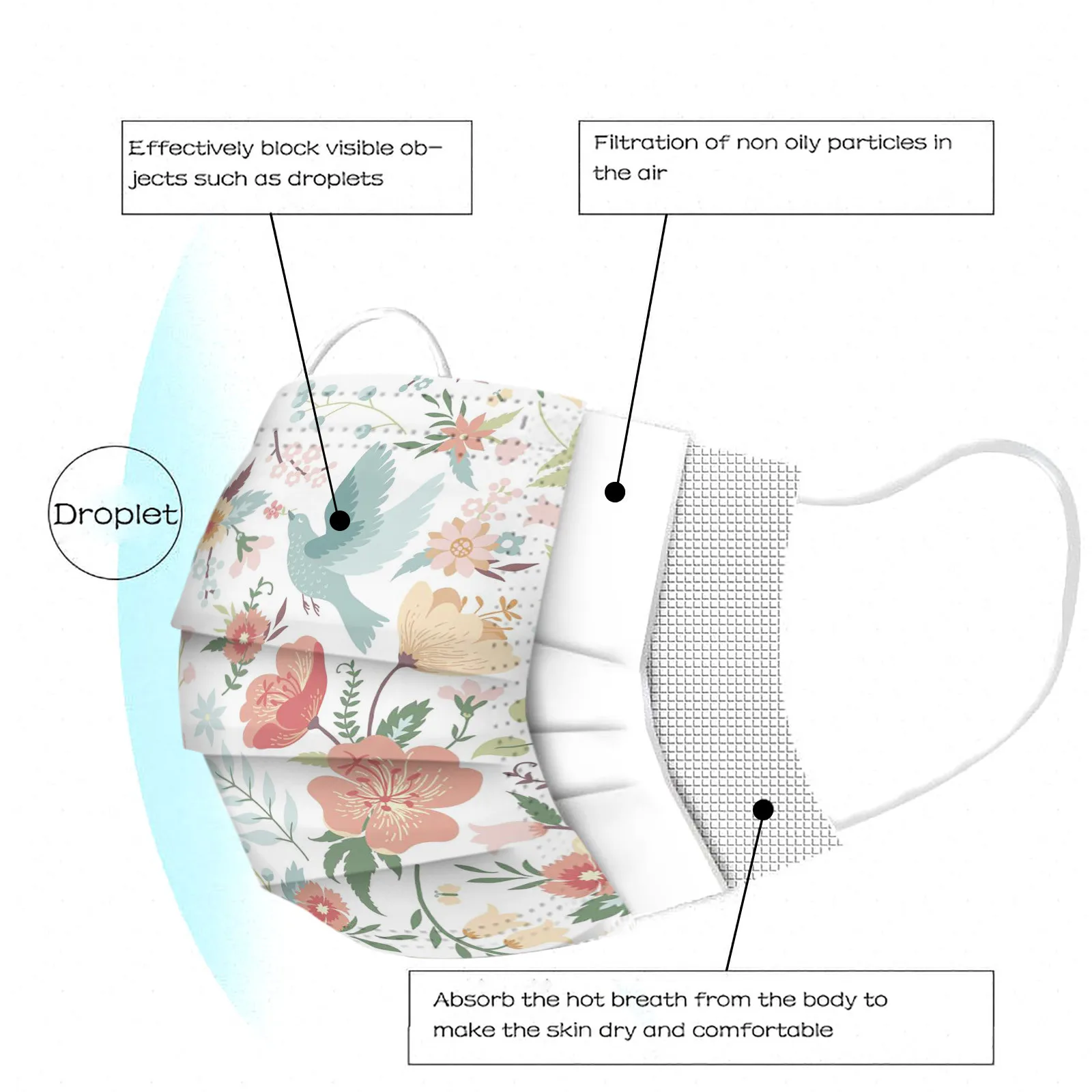В 3 слоя Нетканая одноразовая маска изготовлена из 3 слоев нетканого материала, Безопасен и безопасен для использования. Дышащий материал и милый Узоры, которые делают его полезным и модным. Специальный 3 слоя из нетканого материала Дизайн, обеспечивает некоторую защиту от пыли, автомобильных выхлопных газов, Пыльца и т. д. эластичная Ушная петля, легко носить и не давит на уши. Маникюрный салон или любые другие области, где может потребоваться защита