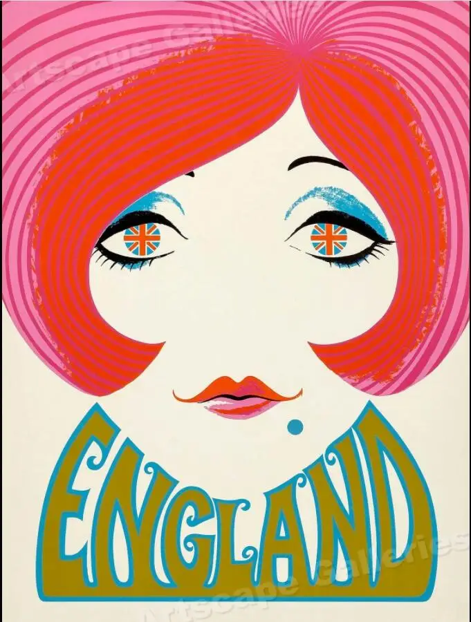 1960s Англия, винтажный стиль, британский флаг, Постер для путешествий, шелковая фотокраска, 24x36 дюймов