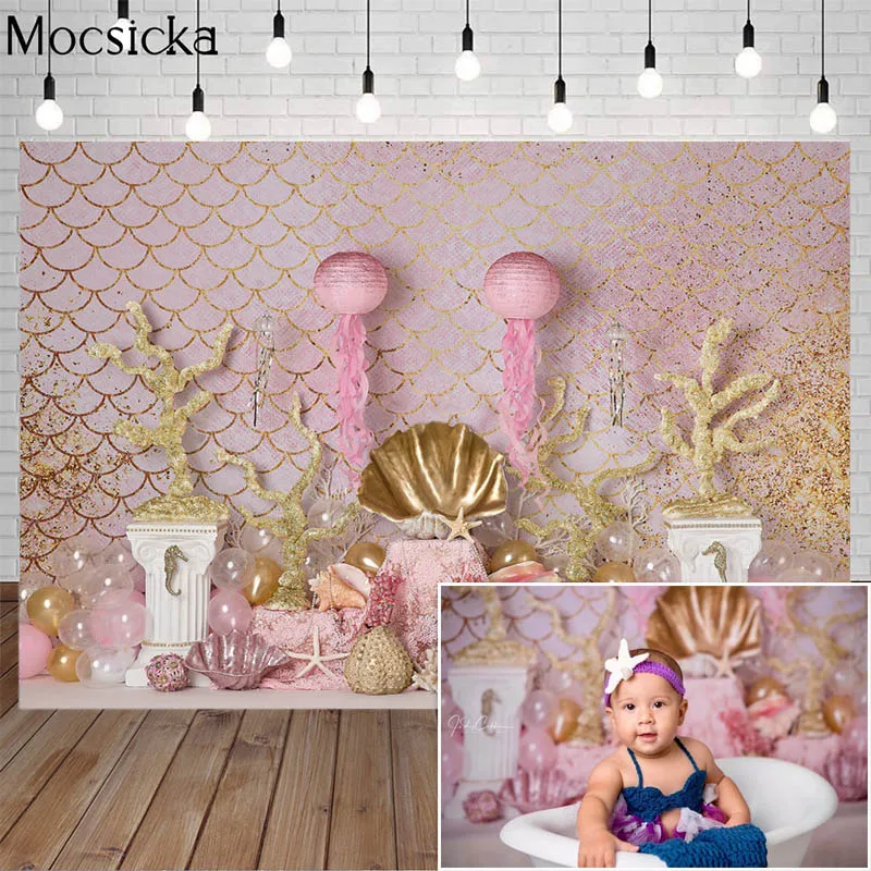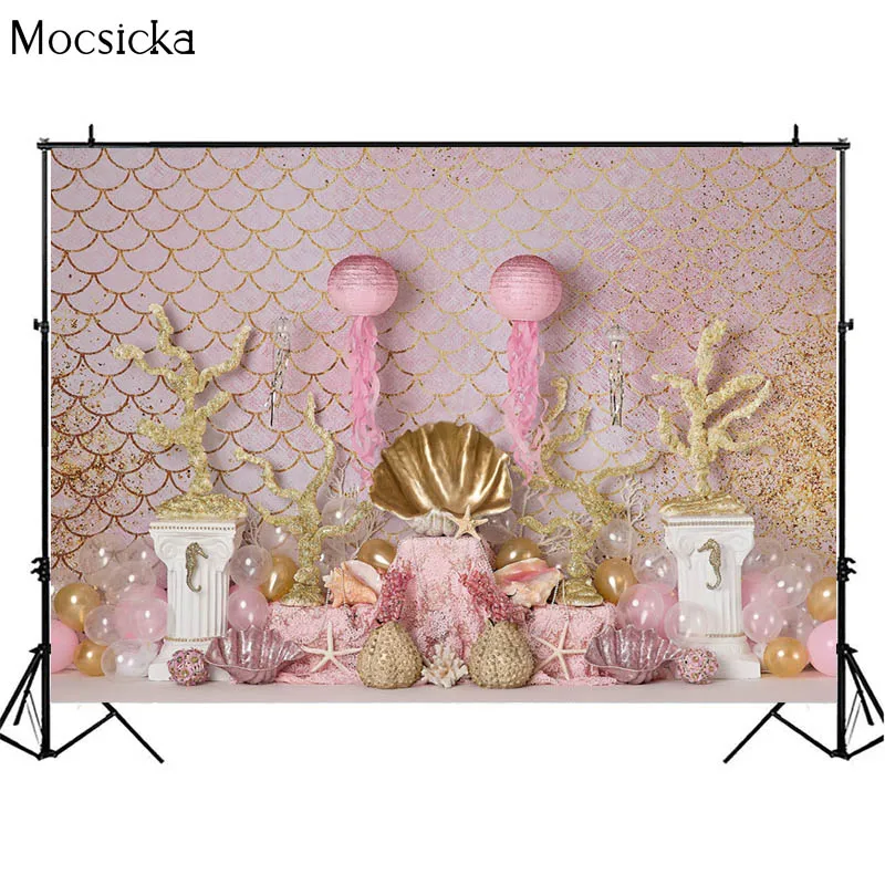 Подводный мир Русалка фон для фотосъемки с изображением золотисто-коралловый розовый шар декоративный реквизит платье принцессы на день рождения для девочек, многоярусная юбка фон для фотосъемки