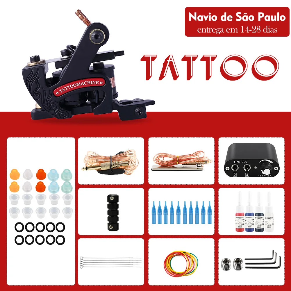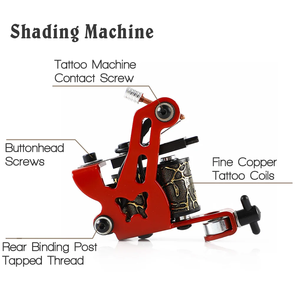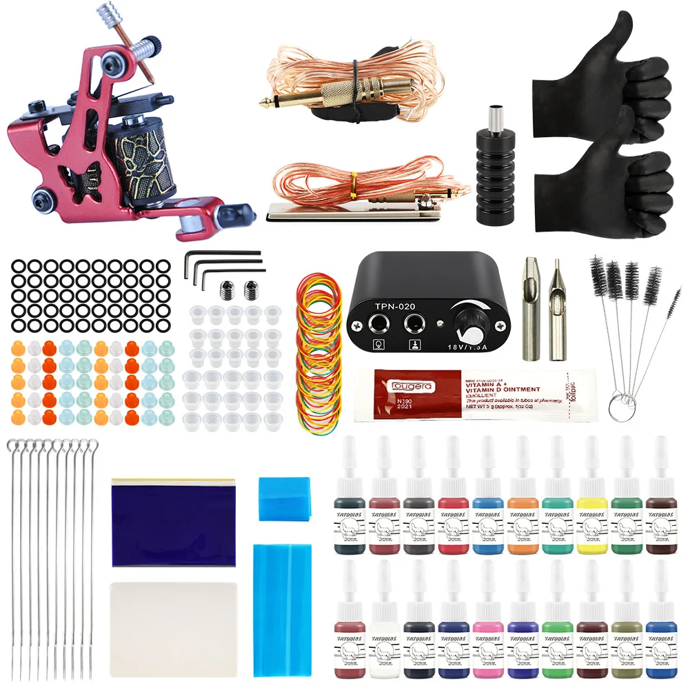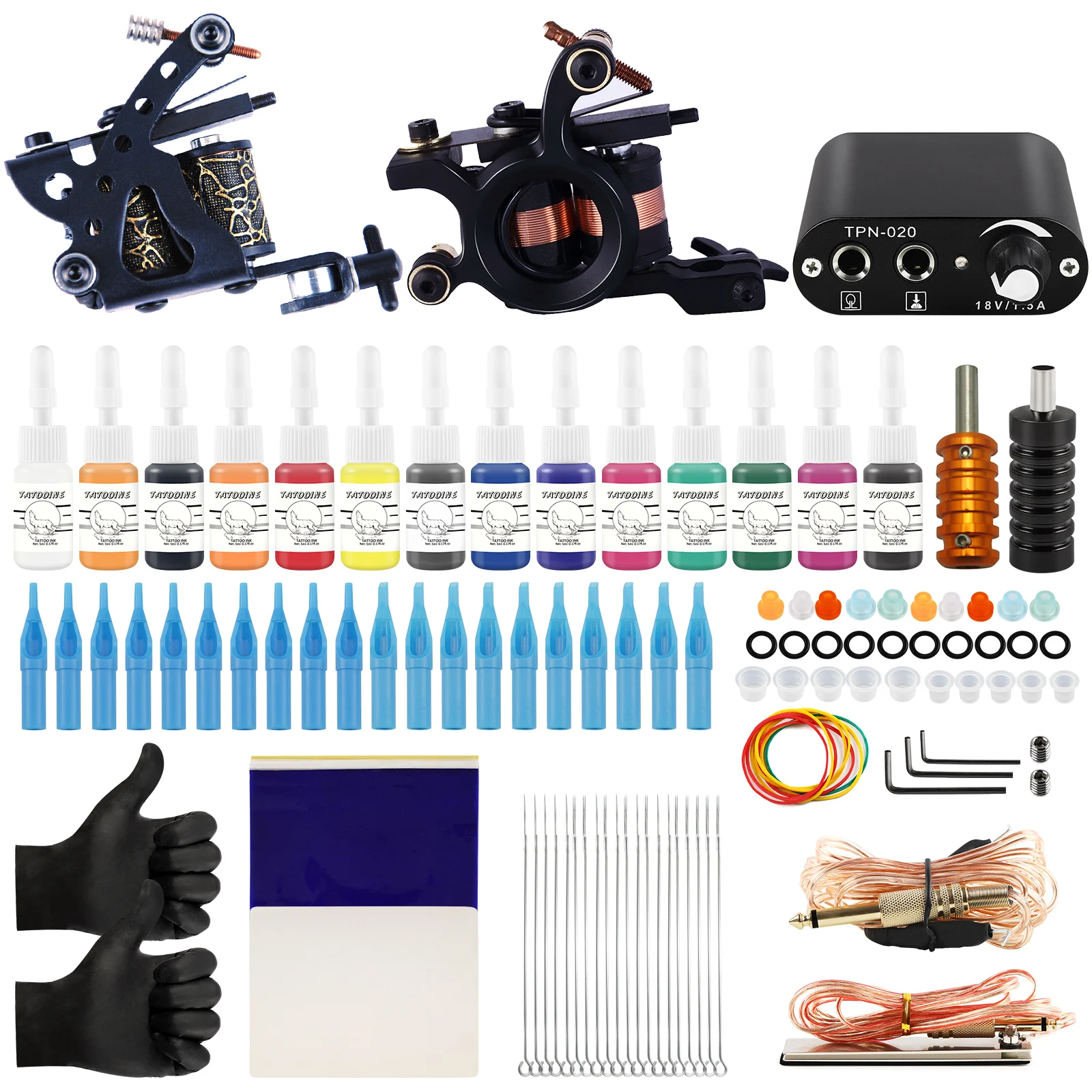 Доллар тату машина для ShadingX1Металлическая тату машина для LiningX1Мини питание SupplyX1Педализатор для ног x114 шт тату InksX1No.5 круглый NeedleX105 футов Синяя Татуировка иглы TipX105Rt синие иглы татуировки TipX10Зажим CordX1Черная Алюминиевая Татуировка GripX1Золотая Нескользящая алюминиевая Татуировка GripsX16 шт. аксессуаров для тату x12 шт одноразовые GloveX1Белая Татуировка практика SkinX1Переводная татуировка PaperX1