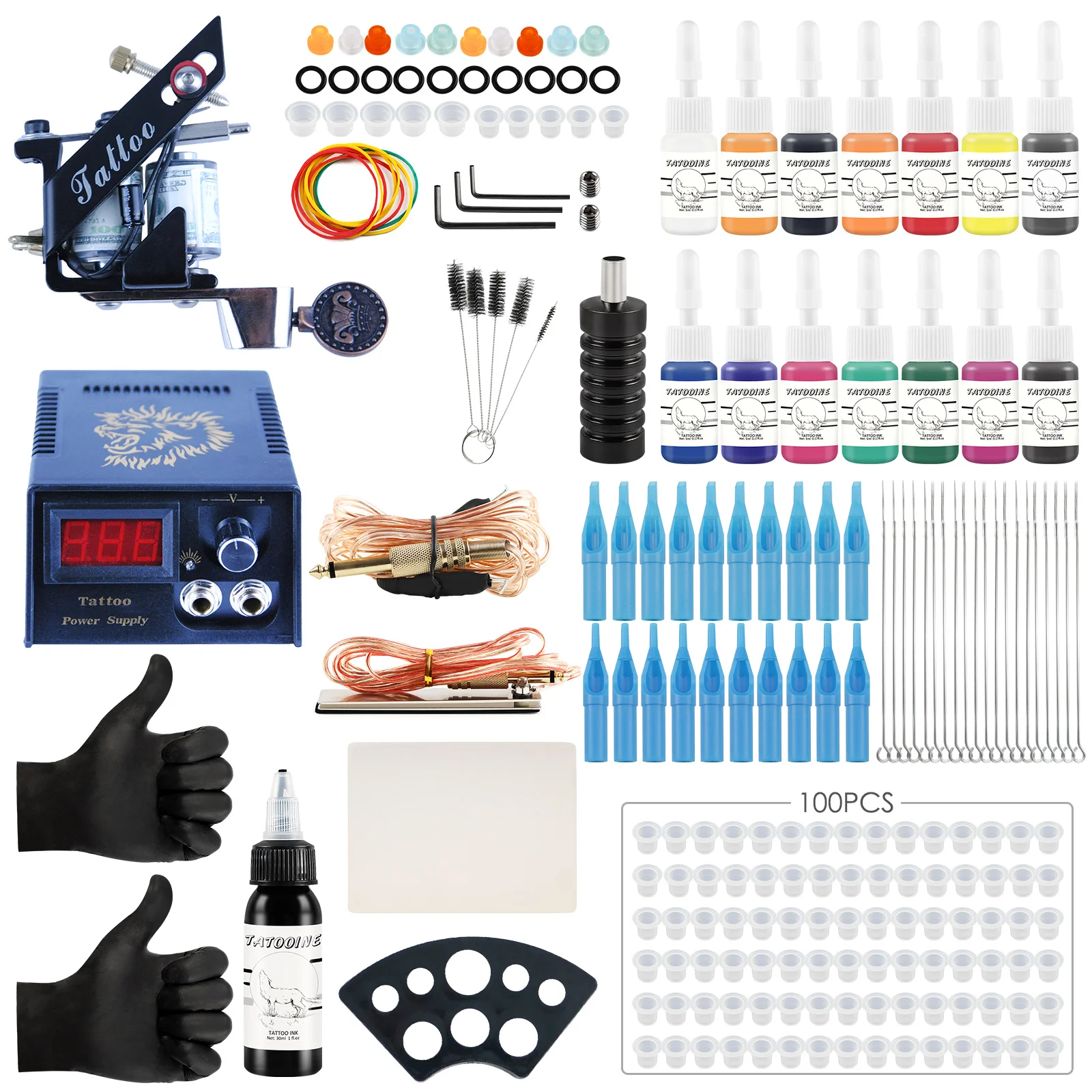 Доллар шаблон татуировки машина для Liningx114 шт тату Inksx130 мл черная Татуировка Inkx1ЖК-дисплей Supplyx1Зажим Cordx1Педализатор для ног x16 шт. аксессуаров для тату x1No.5 Cross Needlex10No.5 круглый Needlex105 футов Синяя Татуировка иглы наконечник x105Rt синие иглы татуировки Tipx10TA005x1Белая татуировка для тренировки кожи x1Татуировка Cuos чернила Holderx12 шт одноразовые Glovex1Кисть для тату x1Тату Gripx1