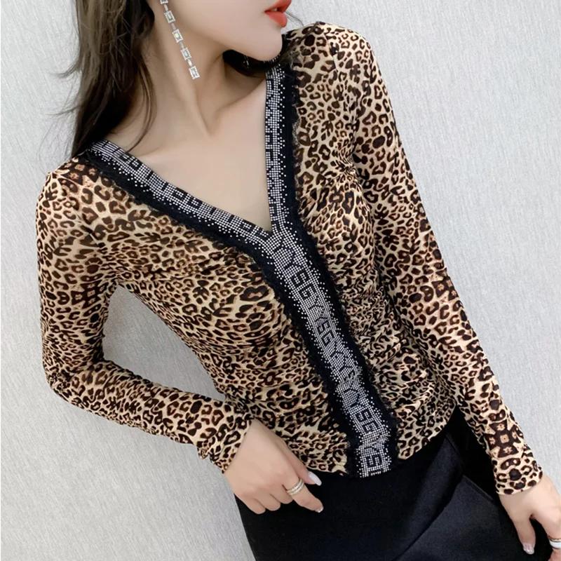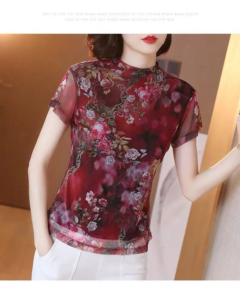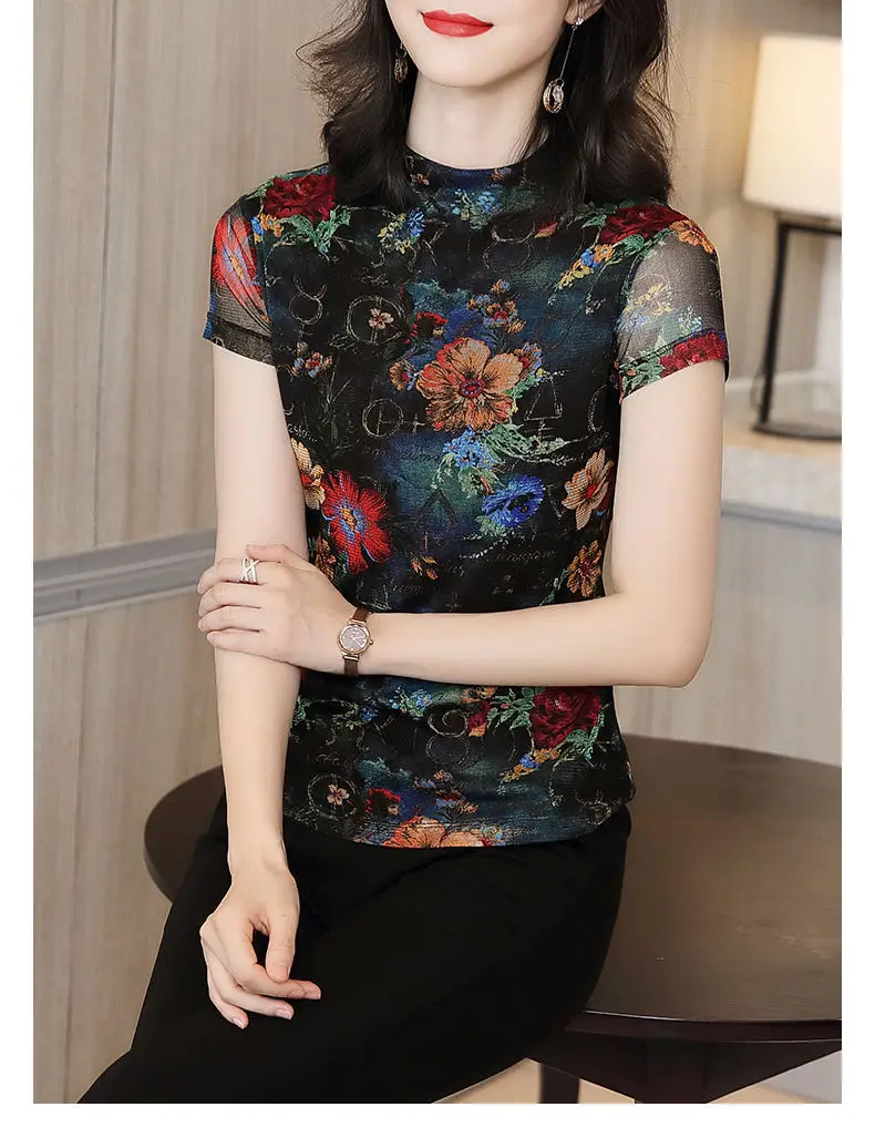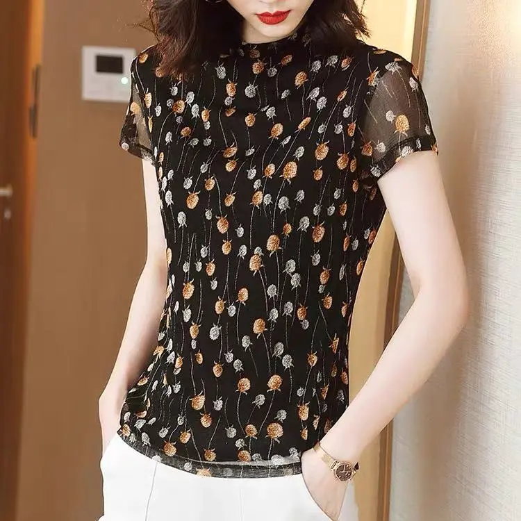 Новая эластичная сетчатая Трикотажная футболка с воротником средней высоты и коротким рукавом, кружевная рубашка с принтом, Женская облегающая блузка с круглым вырезом на лето