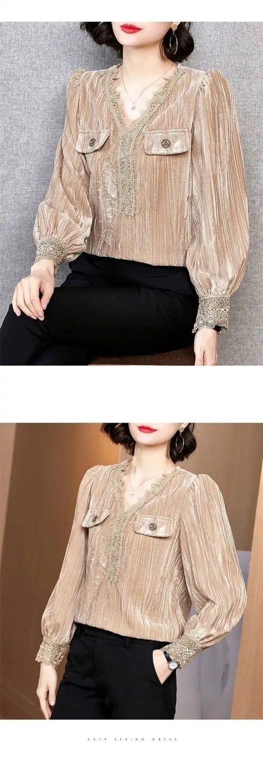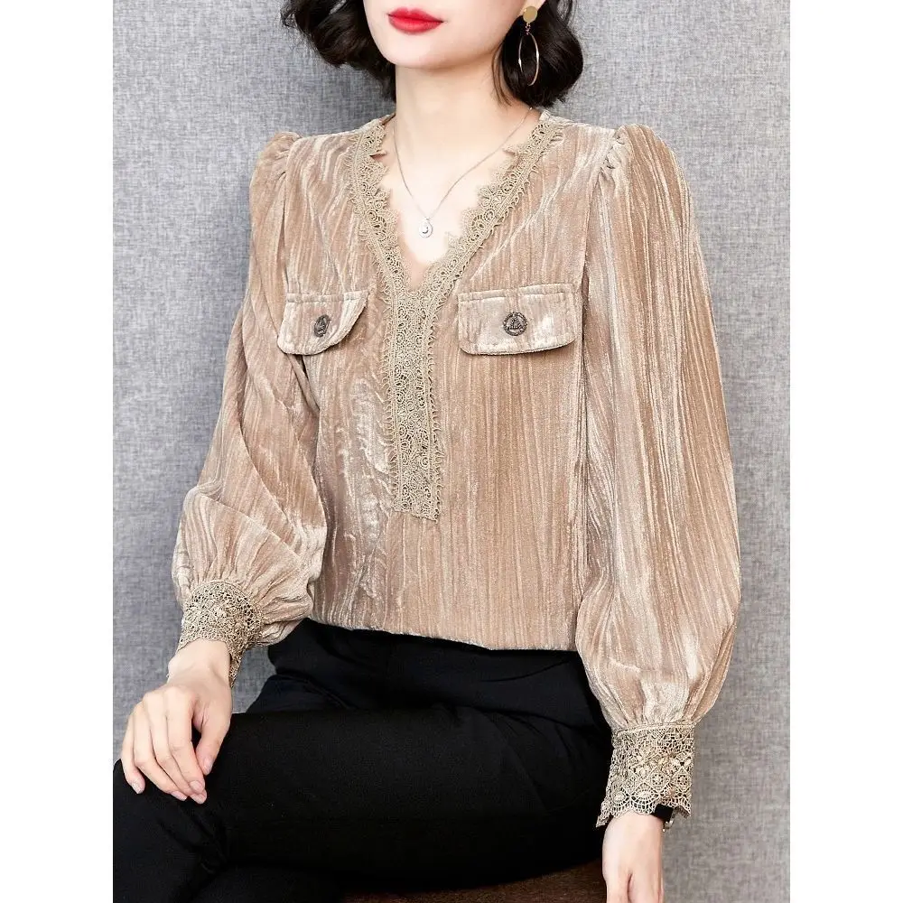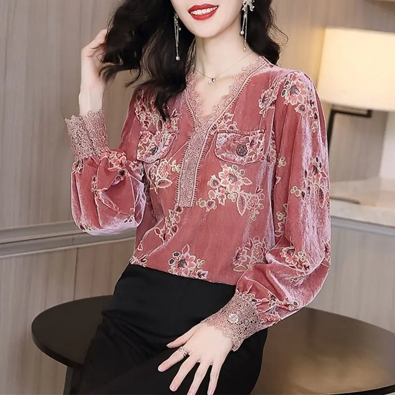 Женский бархатный топ с принтом, свободная футболка с V-образным вырезом и длинными рукавами, в иностранном стиле, весна-осень 2021