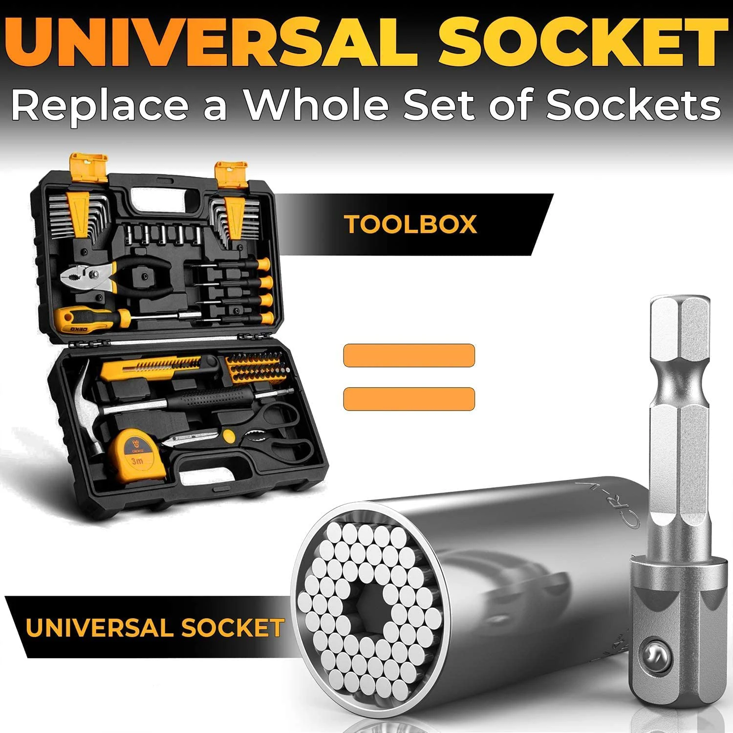 Универсальная Розетка Использует 54 Супер Прочные стальные стержни, которые индивидуально сработаны, что позволяет гнезду автоматически соответствовать любой форме мгновенно. Универсальная Розетка изготовлена из прочного хромированного ванадиевого стального материала, прочная и удобная в переноске.