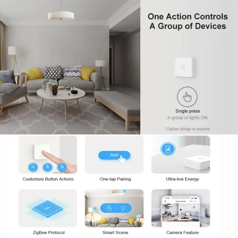 Беспроводной переключатель SONOFF SNZB-01 Zigbee-это мини-и изысканный беспроводной смарт-переключатель ZigBee, отвечающий на мост SONOFF ZigBee, который позволяет достичь цели связи между устройствами ZigBee (умный переключатель SONOFF BASICZBR3 DIY и S31 умная вилка Lite zb) И Wi-Fi устройств. Кнопочный переключатель настраивается с тремя вариантами управления-одним, двойным нажатием и длительным нажатием, так что вы можете, довольно легко, программы и действия так просто, как вам нужно. Сопряжение одним нажатием. Намного проще подключить его к нескольким подключенным устройствам, которыми вы хотите управлять, просто нажмите на приложение, чтобы соединить все устройства. Блеск линий кнопок в его гибкой подвижности, вы можете стратегически разместить его или перемещать его вокруг вашего дома, где это будет наиболее полезно, затем создайте умную сцену, чтобы она работала для вас на основе различных действий кнопок, которые вы настроили. Двустороннее управление доступно даже для включения/выключения светильник в двух местах. Кнопка работает от батареи, что ваш мобильный телефон получит уведомление о низком уровне заряда батареи, когда оставшийся уровень заряда батареи составляет менее 10%, возможно, пришло время изменить батарею.