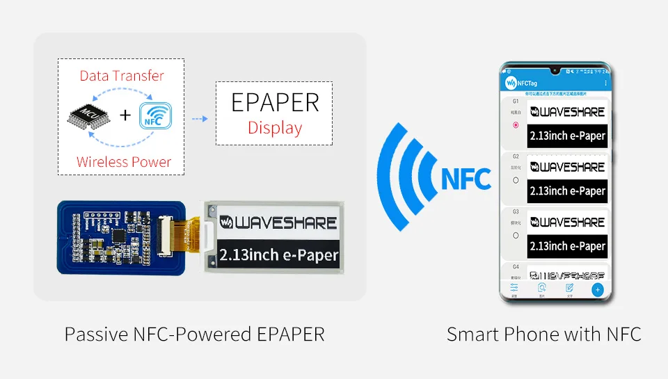 Для обновления содержимого дисплея,Используйте смартфон с функцией NFC или считыватель NFC,Близко к электронной бумаге для беспроводного питания и передачи данных