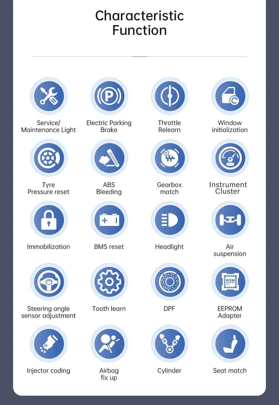 25 сервисных функций для различного планового обслуживания и технического обслуживания, включая: сброс масла, EPB, TPMS, BMS, обтекание тормозов, DPF, Immo ключи, инжектор, SAS, подвеска, дроссельная заслонка, WIN DR крыша, сиденья, одометр, изменение Ланга, фары, CHG размер шин, TEC Learn, ABS/SRS, Цилиндр, турбонаддув, лимит, сцепление, адаптация, сброс подушки безопасности.Он обеспечивает адаптацию компонентов или различные функции кодирования для пользовательских конфигураций, а также позволяет перепрограммировать адаптивные значения для некоторых компонентов после ремонта.Наиболее часто выполняемые Сервисные функции включают:Сброса масла обслуживание:Позволяет выполнить сброс для системы срока службы моторного масла, которая подсчитывает оптимальный интервал изменения срока службы масла в зависимости от условий вождения автомобиля и погоды.EPB сервис:Помогает поддерживать электронную тормозную систему безопасно и эффективно, деактивируя и активируя систему управления тормозом, помогая с контролем тормозной жидкости, открывая и закрывая тормозные колодки, и устанавливая тормоза после замены диска или колодки, И т. д.SAS сервис:Позволяет выполнять калибровку для датчика угла поворота рулевого колеса, который постоянно сохраняет текущее положение рулевого колеса как прямое положение в датчике угла поворота рулевого управления EEPROM.DPF услуги:Позволяет выполнять множество функций дизельной системы Сажевых фильтров.Услуги TPMS: позволяет быстро просматривать id датчика шин от ЭБУ транспортного средства, а также выполнять Программирование TPMS и процедуры сброса после замены датчиков шин.IMMO сервис:Программирует Новый Противоугонный ключ и выполняет соответствие ключей при замене выключателя зажигания, комбинированной приборной панели, ЭБУ, БСМ или батареи дистанционного управления.И многое другое...