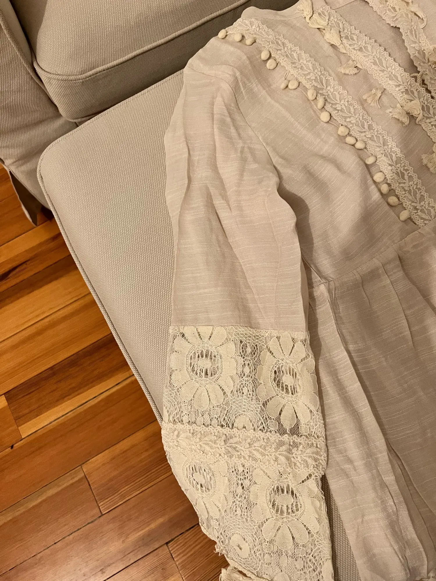 На фото в статье смотрится натуральная ткань... Наивысшего качества. Но ткань синтетическая... Синтетическое кружево бара и рукава не выглядело хорошо. Похоже на ткань для штор... Ожидаемое качество по стоимости... Не такой, как на фото