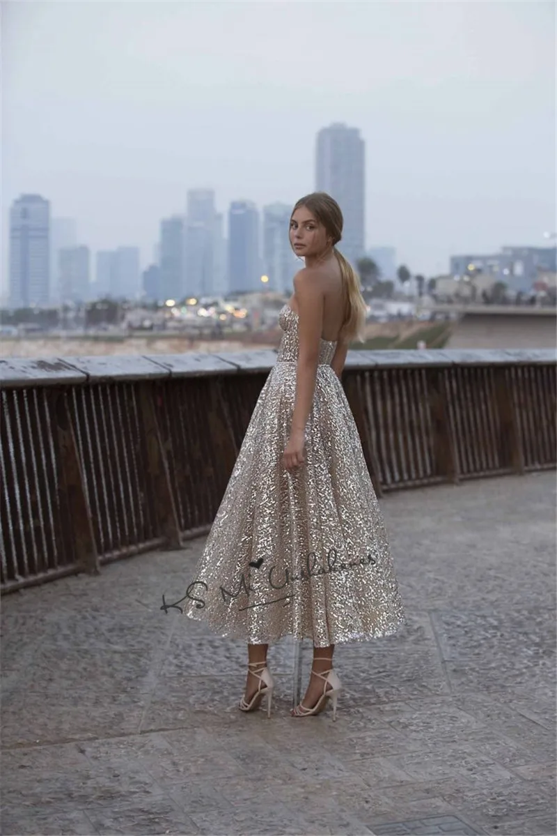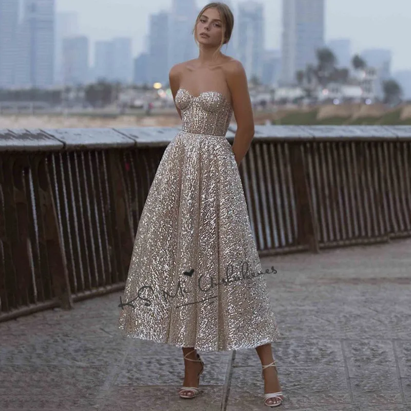 Сексуальные роскошные вечерние платья 2021, короткое платье цвета шампань для выпускного вечера, платье до середины икры с блестками, женское платье от кутюр
