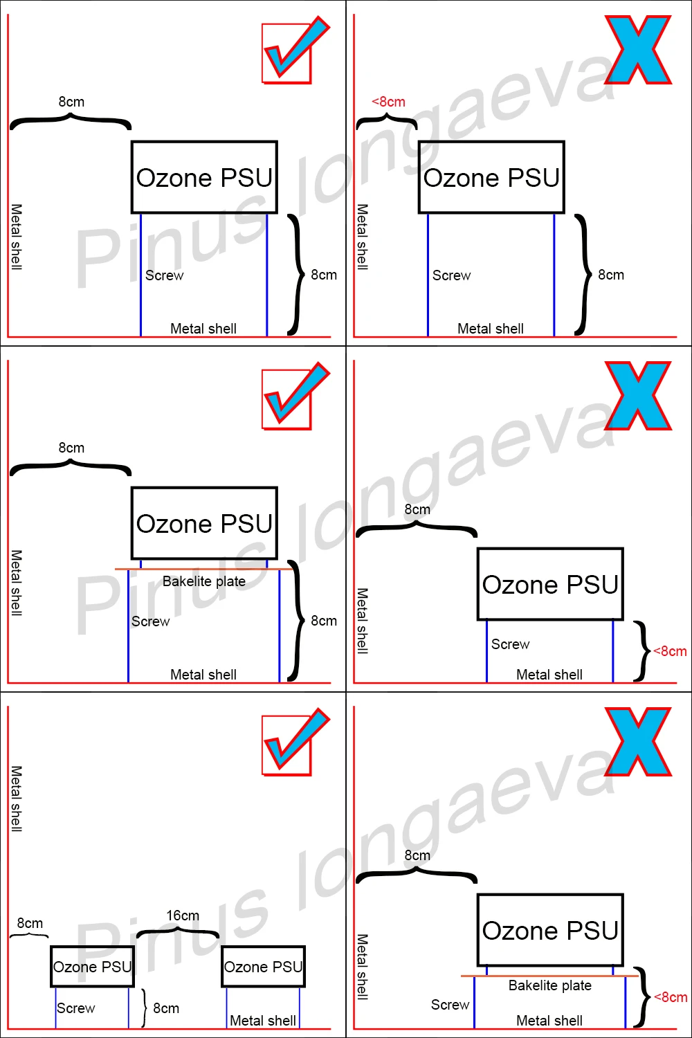 1. Озоновая трубка: вам нужно установить ее на изоляционную доску, вдали от металлической оболочки более 2 см. (Если вы установите его на металлическом корпусе, подключите дополнительный заземляющий провод.)2. Озоновый Блок питания: вы можете использовать винты длиной 9 см для установки озонового блока питания (источник питания озона) вдали от озоновой трубки (металлический корпус или другие электрические приборы) более 8 см.
