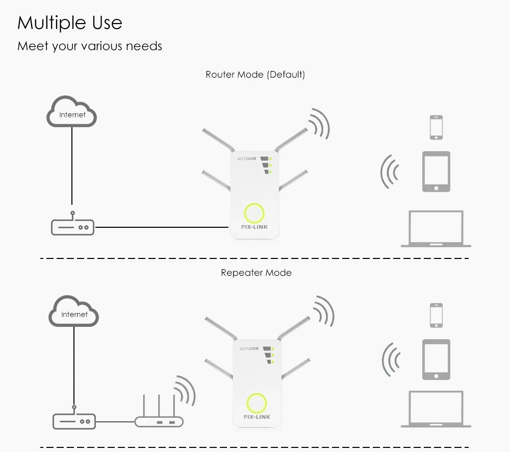 Удлинитель может принимать существующий беспроводной сигнал 2,4 ГГц или 5 ГГц, повторять и расширять его до более длительного диапазона, где он находится слишком далеко от маршрутизатора или точки доступа. Увеличьте сигнал Wi-Fi и большие зоны покрытия, или в качестве функции маршрутизатора или режима AP