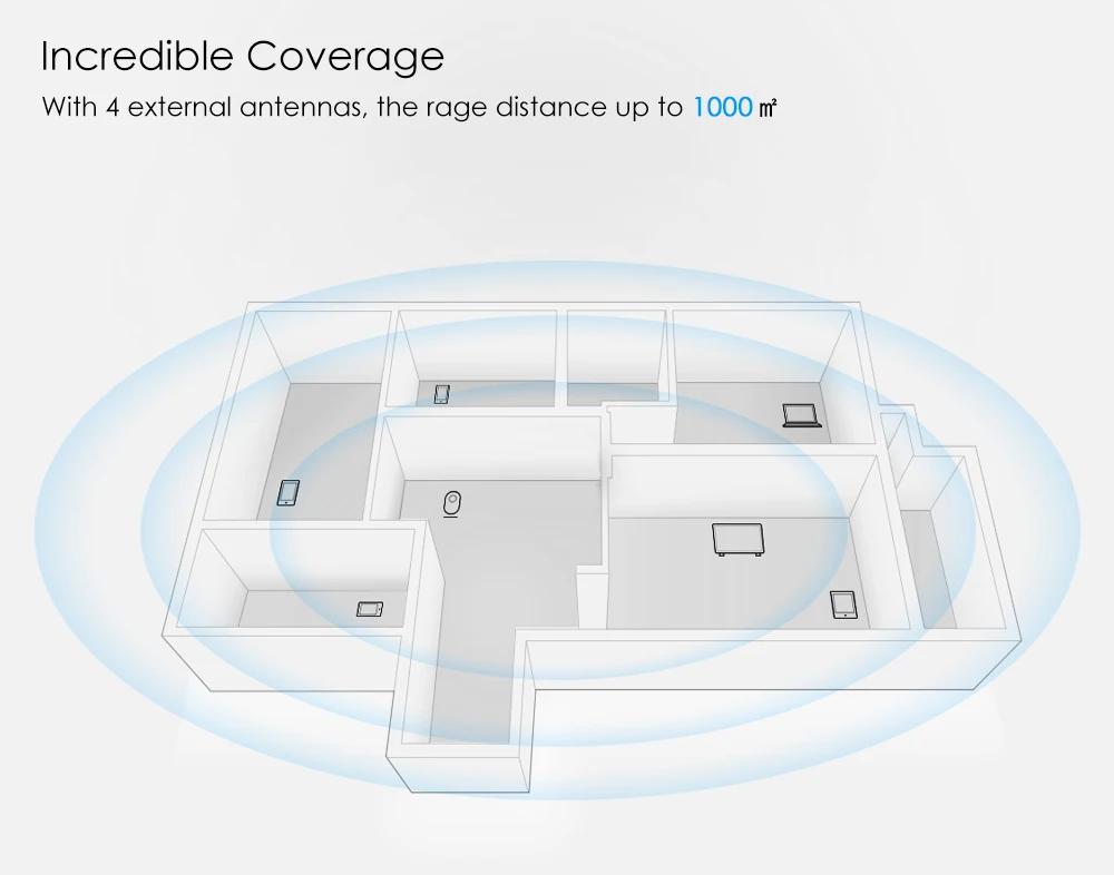 С четырьмя внешними антеннами, поддерживает WiFi 2,4/5 ГГц, скорость WiFi до 1200 Мбит/с, площадь покрытия до 1000 квадратных метров