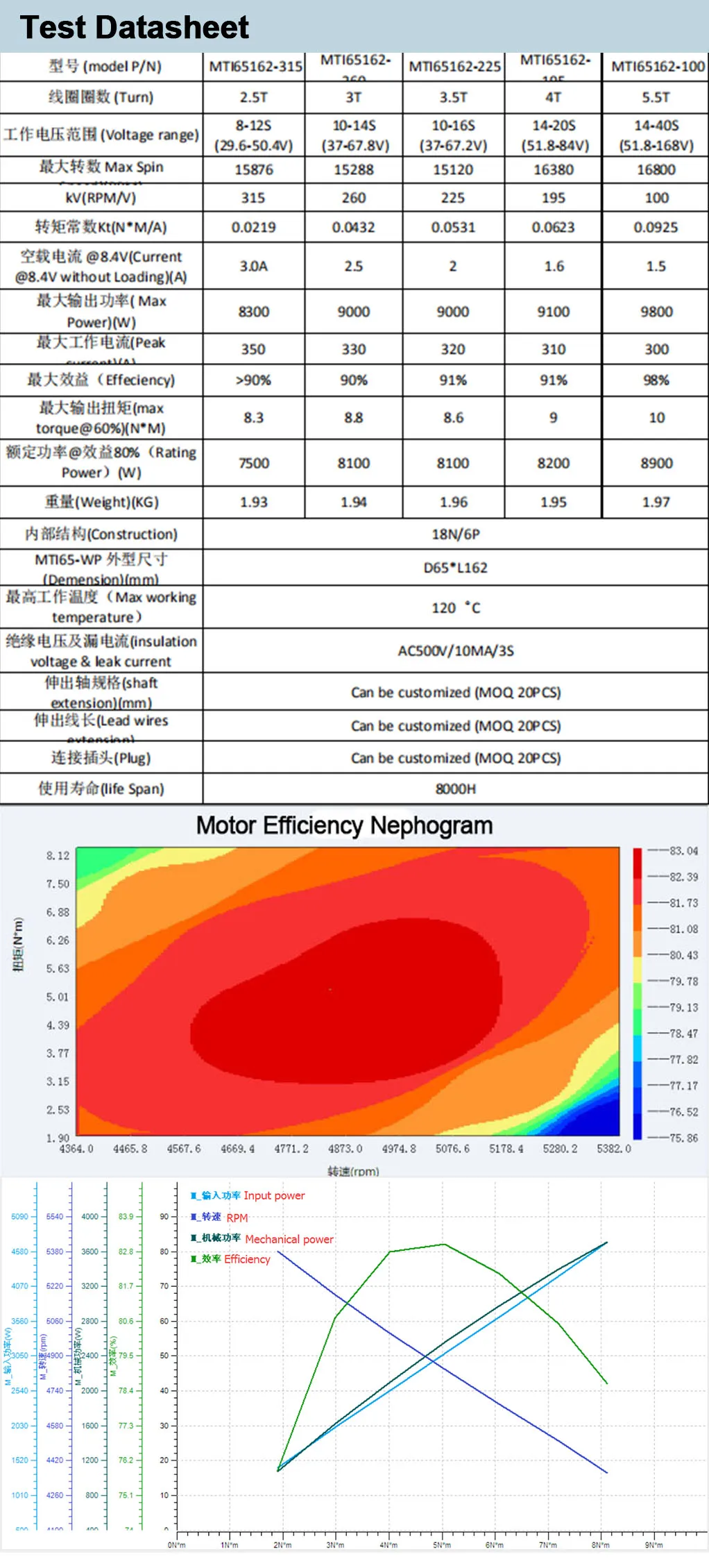Номер модели: MTI65162-100/120/195-SFAvaiblable KV: 100/120/195KVРазмер: Φ65x 161,5 ммТип двигателя: двигатель без датчика ХоллаДвигатель Вес: 2,8 кгМаксимальный ток: 310AМаксимальная мощность: 9100 ВтНоминальная мощность: 8100 ВтМаксимальный крутящий момент: 9 Н. МКабель двигателя/разъемы: 1,2 метровый кабель с 8 мм разъемыВариант вала:12 мм шлицевой вал с пропеллером (7,25*6 дюймов);12 мм винтовой вал без пропеллераMax Lipo Cell: 100кв/120кв 6-18 с; 195кв 6-16 с.