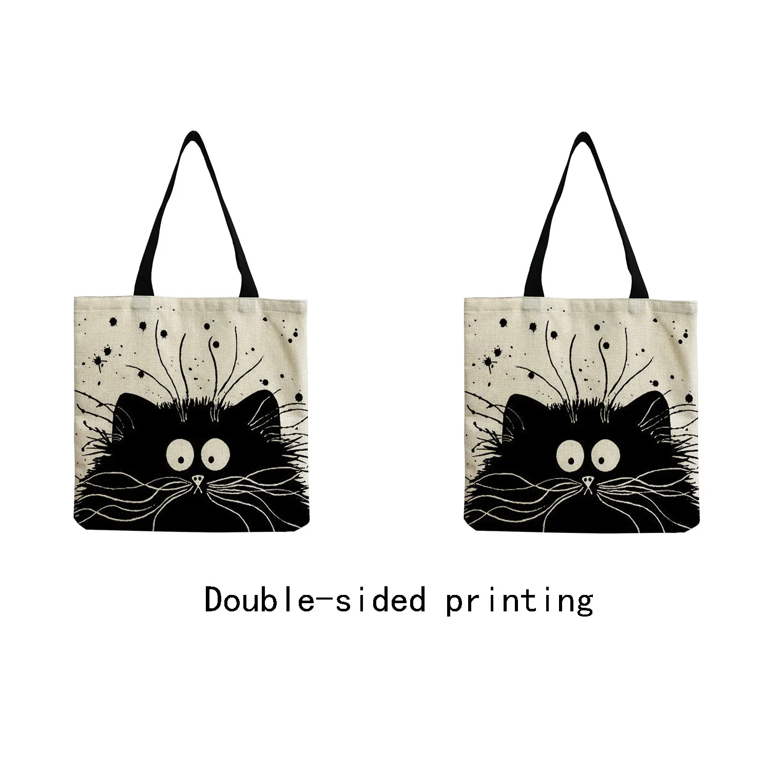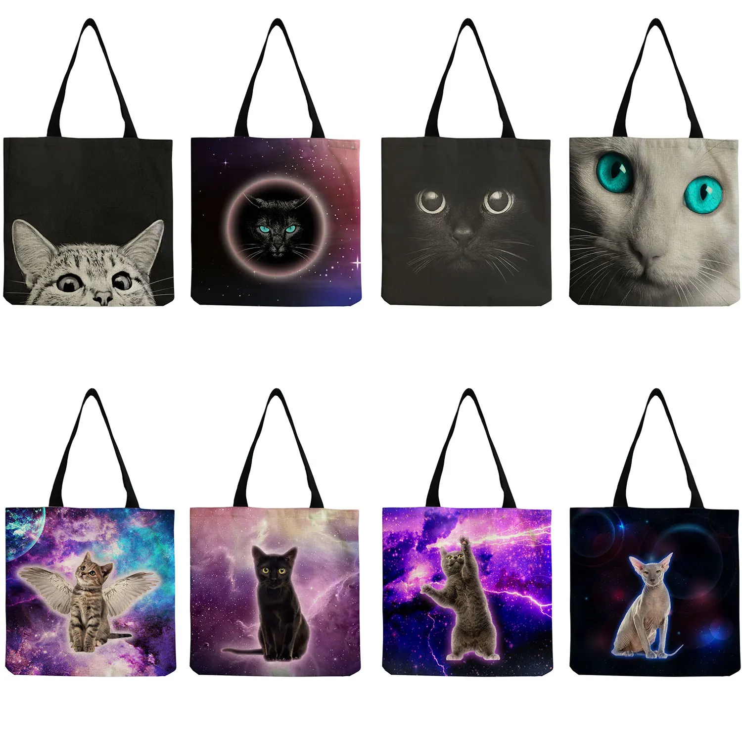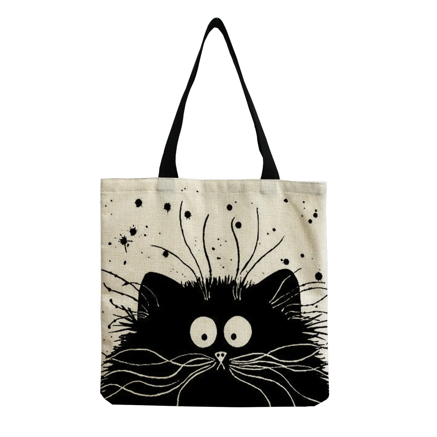 Повседневная женская сумка с милым рисунком кота, Большая вместительная сумка-тоут, сумка для девочки, Льняная сумка для хранения, сумка на плечо с индивидуальным узором