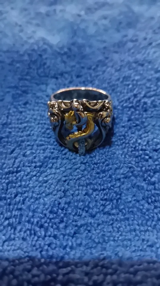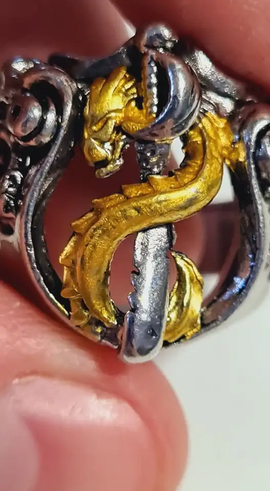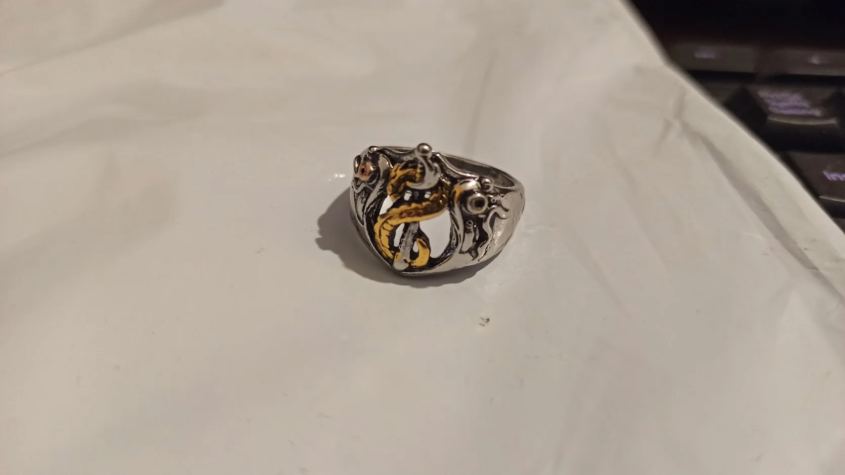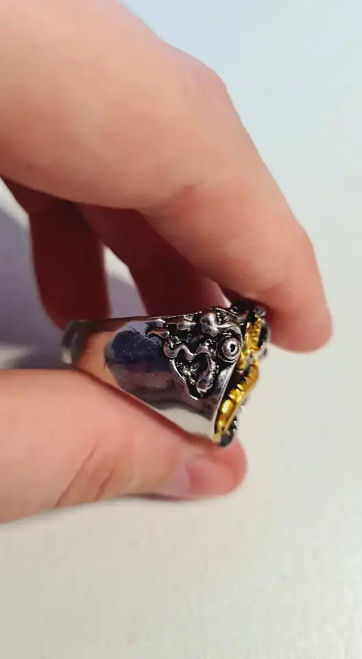 Я не ожидала многого, так как список представляет собой 3d-изображение кольца, но IRL, le sculpt не очень точный, это немного грубая и золотые биты окрашены или покрыты, но не так хорошо, он показывает на некоторых частях. Качество металла не очень хорошее, он довольно легкий и, возможно, согнется, если я надавлю. Это не плохо, так как я не ожидал, что это будет лучше, но ясно, что ничего общего с указанным изображением.