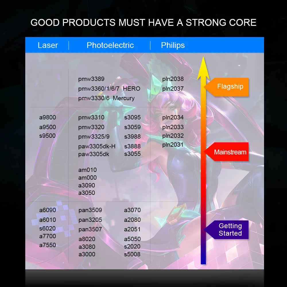 Основная модель нашей мыши P3330, которая является хорошим ядром; 5000DPI,500HZ Частота опроса, 30G ACC;
