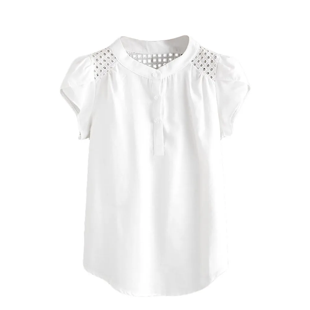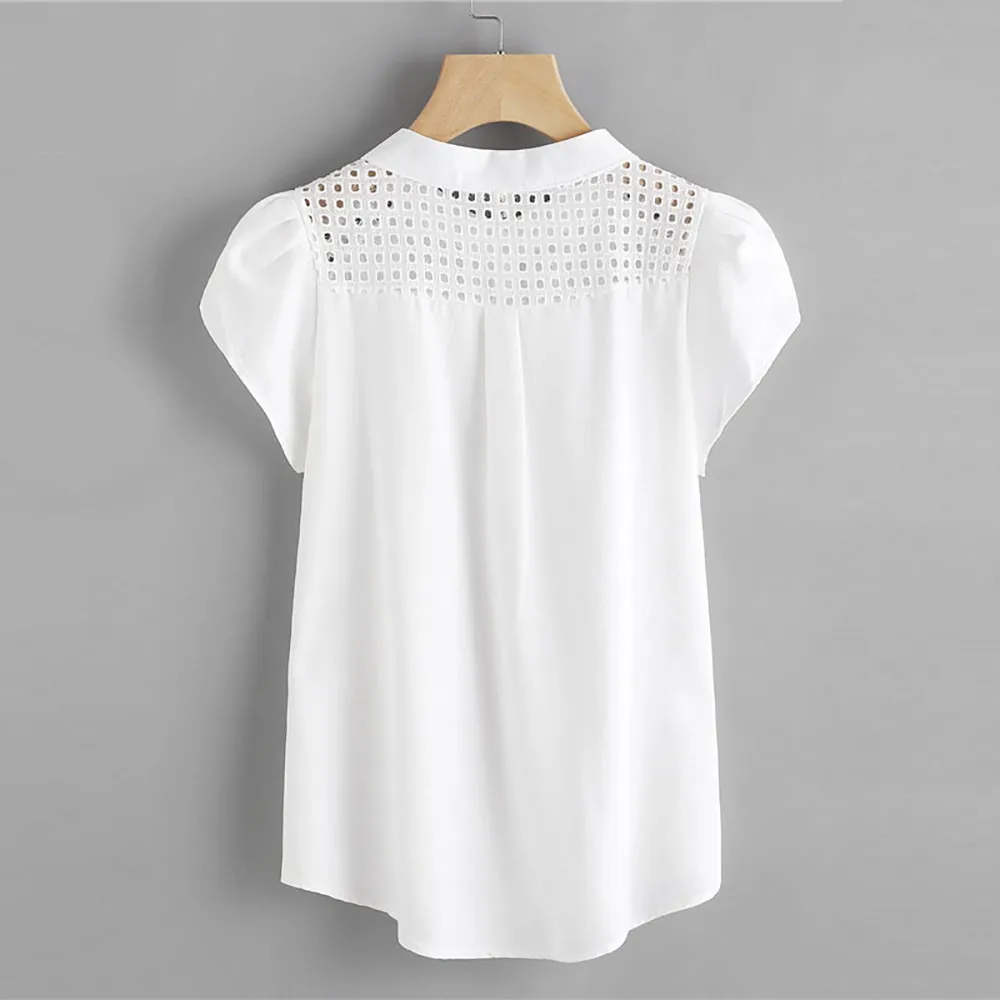 Женская Однотонная рубашка с круглым вырезом, ажурная Повседневная Блузка с коротким рукавом-бабочкой, женская одежда рубашка, 2021