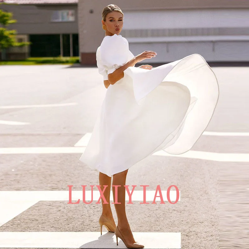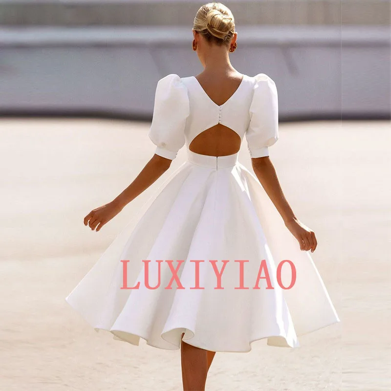 Свадебное платье LUXIYIAO LO73, простое и чистое атласное короткое, с пышными рукавами, до колен, пикантное платье невесты с открытой спиной, свадебное платье