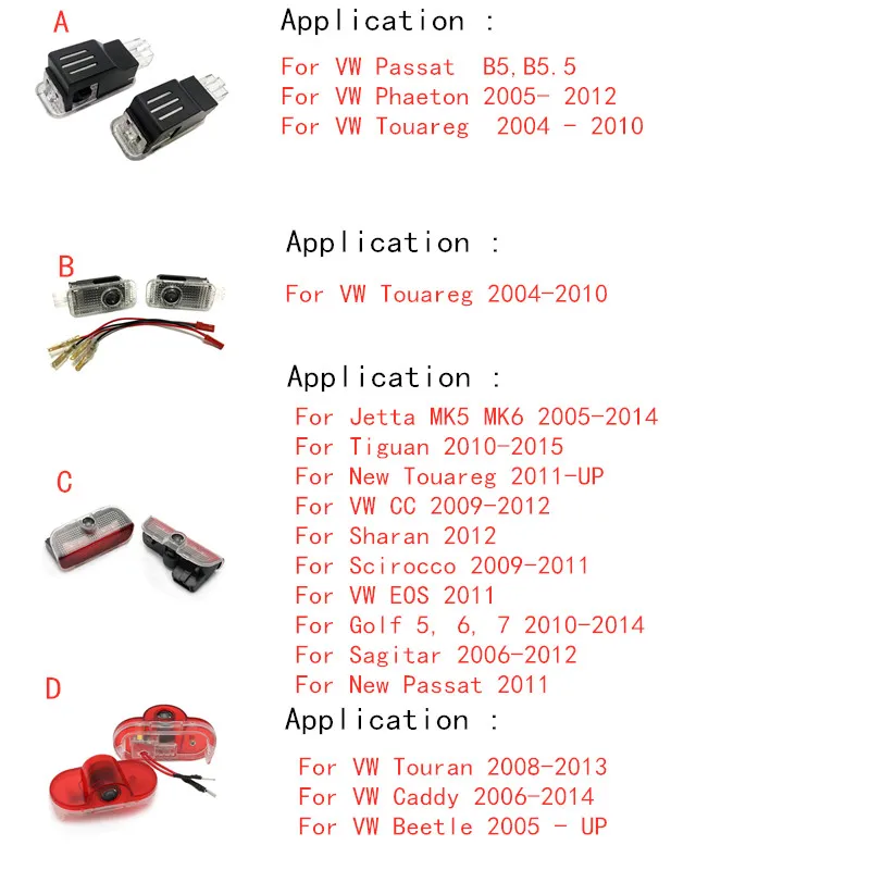 Применение: A Для VW Passat B5,B5.5 Для VW Phaeton 2005- 2012 Для VW Touareg 2004 - 2010 Применение: B Для Volkswagen VW Touareg 2004 2005 2006 2007 2008 2009 2010 Применение: C Для Jetta MK5 MK6 2005-2014 Для Tiguan 2010-2015 Для New Touareg 2011-UP Для VW CC 2009-2012 Для Passat B6 B7 Для Sharan 2012 Для Scirocco 2009-2011 Для VW EOS 2011 Для Golf 5, 6, 7 2010-2014 Для Sagitar 2006-2012 Для нового Passat 2011 Применение: D Для Volkswagen VW Для VW Golf 4 Для VW Touran 2008-2013 Для VW Caddy 2006-2014 Для VW Beetle 2005 - UP Особенности: Напряжение: 12 В Цвет: белый. Тип светодиодный: чип Cree. Потребляемая мощность: 7 Вт. Материал: АБС + алюминиевый сплав. Температура рабочей среды: -40 градусов ~ 105 градусов. -Специальные Особенности: лазерный светильник, дверной светильник s, приветственный светильник. -Устанавливается просто, хорошо выглядит и полезен, низкое энергопотребление. -Этот список предназначен для пары удивительных дверных ступенчатых лазерных прожекторных теневых ламп. -Просто вытащите свой старый светильник и вставьте этот продукт без проводов или отверстий для сверления. Посылка: 2 шт. логотипа дверных огней (2 шт. для 2 дверей)