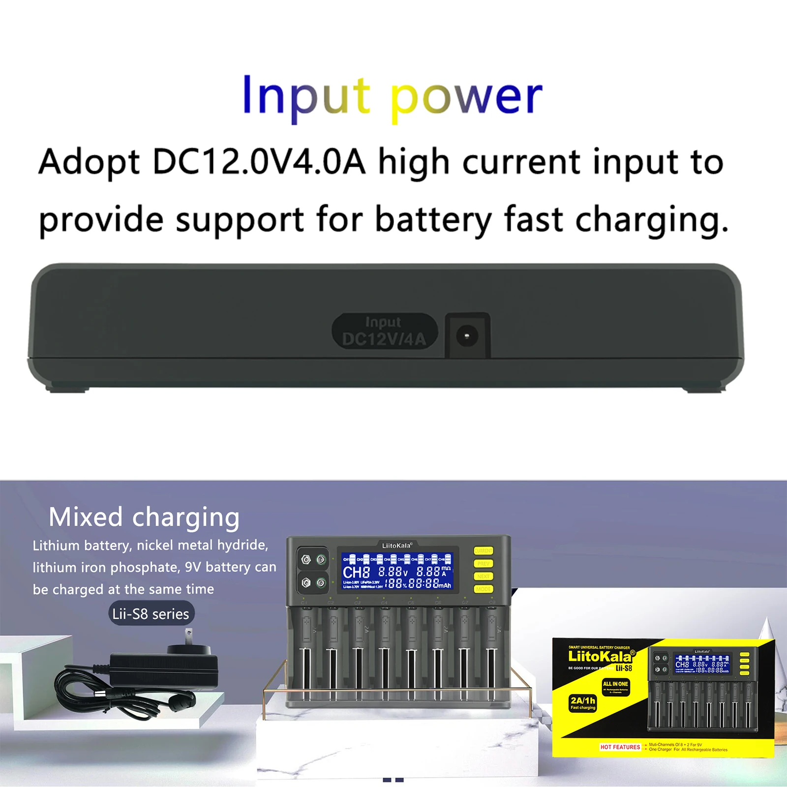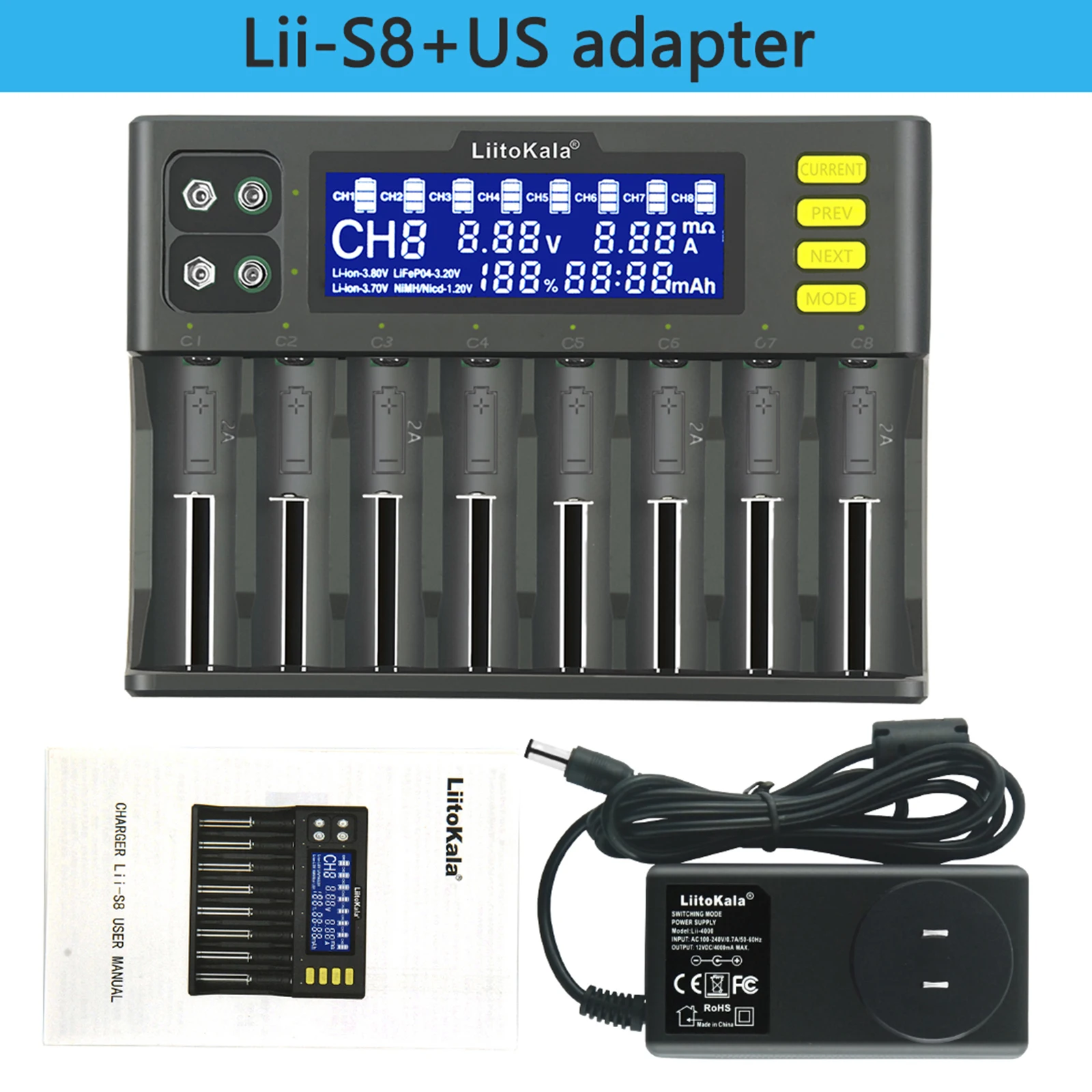 Зарядное устройство LiitoKala Lii-S8, для литийионных аккумуляторов 3,7В, никель-металлогидридных 1,2В, литий-железо-фосфатных 3,2В, IMR 3,8В, для аккумуляторов 18650, 26650, 21700, 26700, AA, AAA
