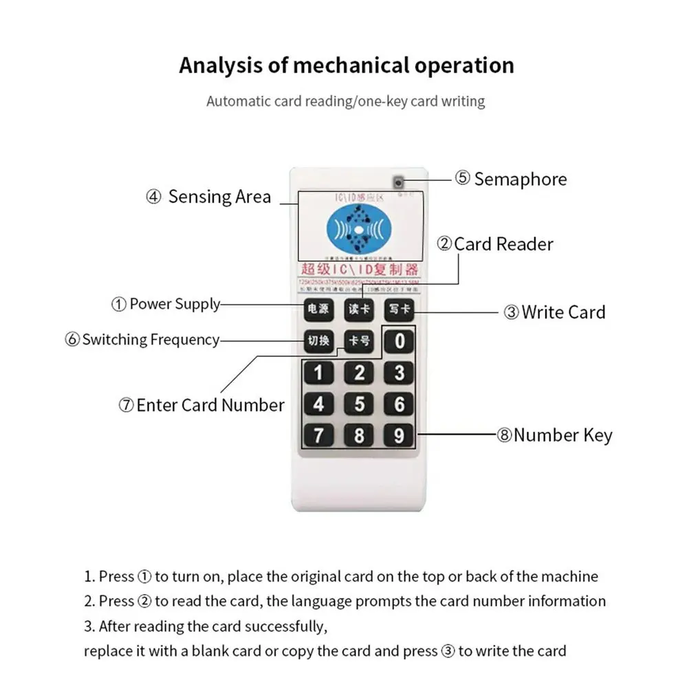 1. Функция кардридера или кардридера: небольшой размер, эргономичный, удобный для переноски и удобный для повседневного использования. Чтение (английский голос) и запись кнопок, управление более простое и удобное.