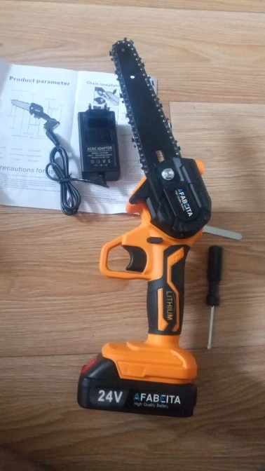 Ехала очень долго. Получил, коробка как с футбола, но все цело. Упаковка хорошая. Аккумулятор зачем-то был подключен. Зарядное очень лёгкое, подозрительно. Аккумулятор был заряжен. Никаких индикаторов заряда нет, но стартует бодро. Разобрал, смазка есть, но ее нет там где надо. Смазал редуктор корпус которого из пластика. Смазал цепь и шестерню подачи цепи. Звенящий звук пропал после смазки. В шине присутствует звёздочка. Аккумулятор не разбирал, достаточно лёгкий. Имеется светодиодная подсветка, включается перед включением пилы. Можно подсветить место пиления, а потом начать пилить. В целом то что я хотел.