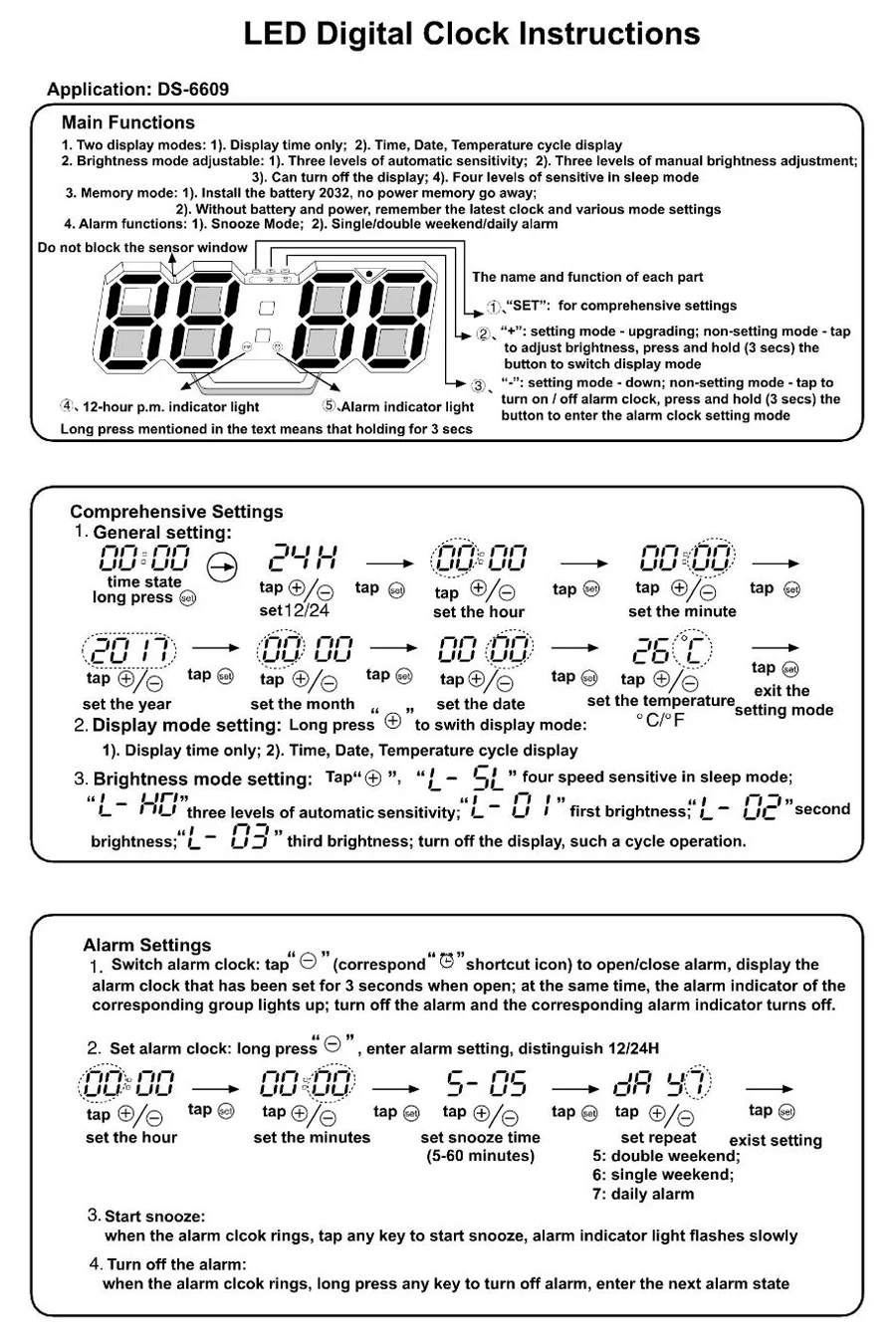 Основные функции: 1) Энергосбережение 2) светильник обнаружения 3) Сигнализация 4) подвесная конструкция 5) Повтор 6) Отображение температуры 7) Отображение даты 8) 3 уровня яркости