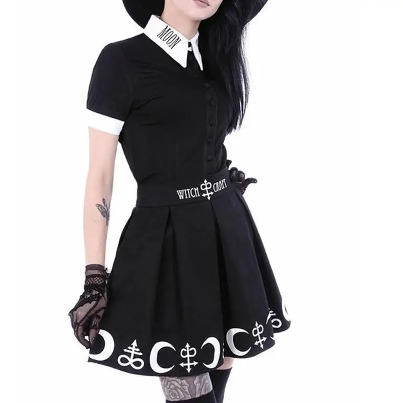 2021 Харадзюку панк Рок готическая юбка черная женская с принтом ведьмы Луны Высокая талия ведьмы ремесло Луна Звезда принт готика Плиссированное Скейтер