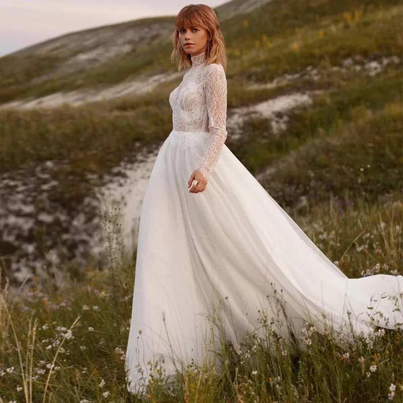 Платье невесты с высокой горловиной 2021 кружевное Тюлевое платье с подметальным шлейфом А-силуэт элегантное облегающее верхнее белье под заказ размер и цвет