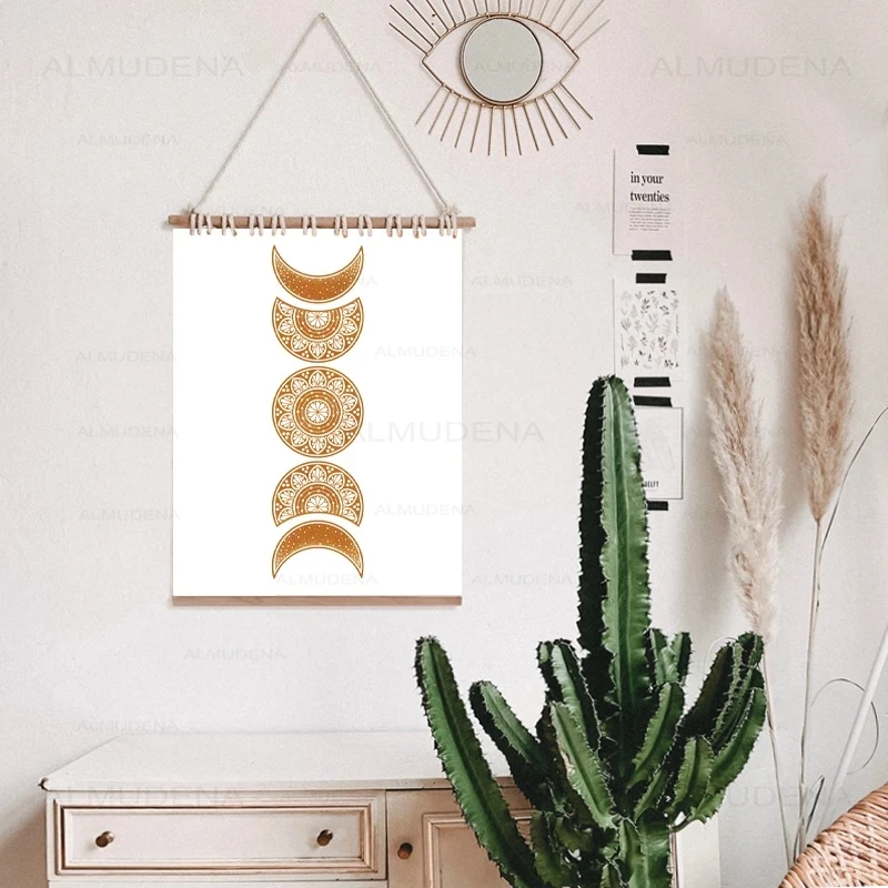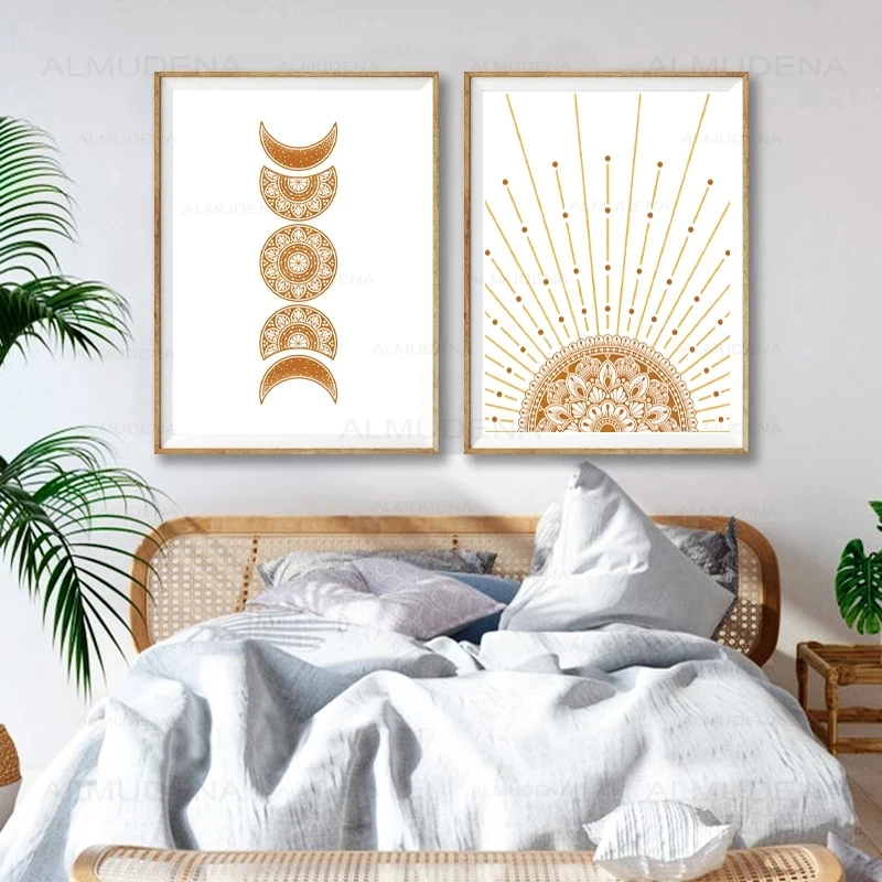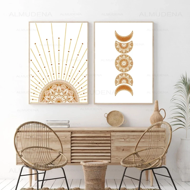 Фон с изображением Солнца и Луны, мандалы, современная картина середины века, рисунок на стену, сгоревший оранжевый цвет, Сакральная геометрия, Картина на холсте, декор в стиле бохо