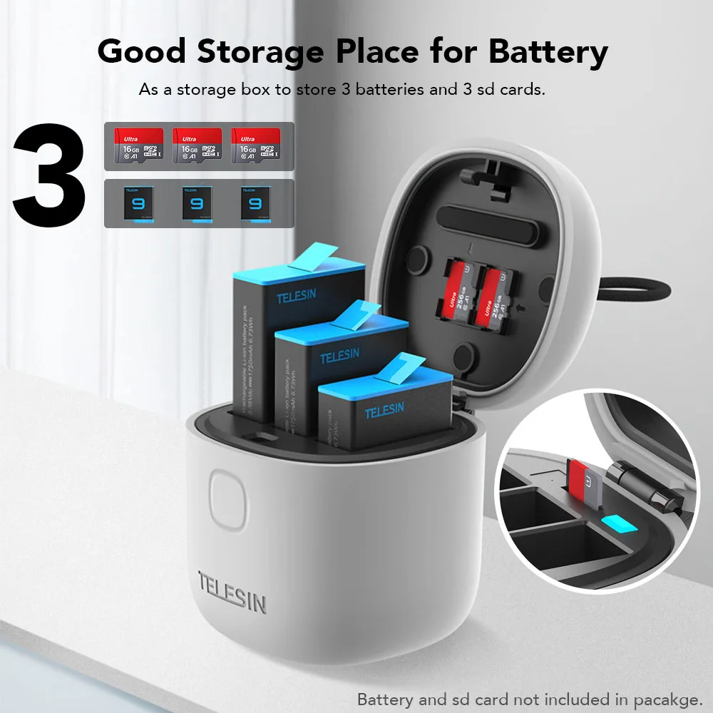 Быстрое зарядное устройство для аккумуляторов GoPro 9 10, 3 слота, хранилище батарей 1750 мАч, литий-ионный аккумулятор, чехол для телефона 10 дюймов, Экшн-камера
