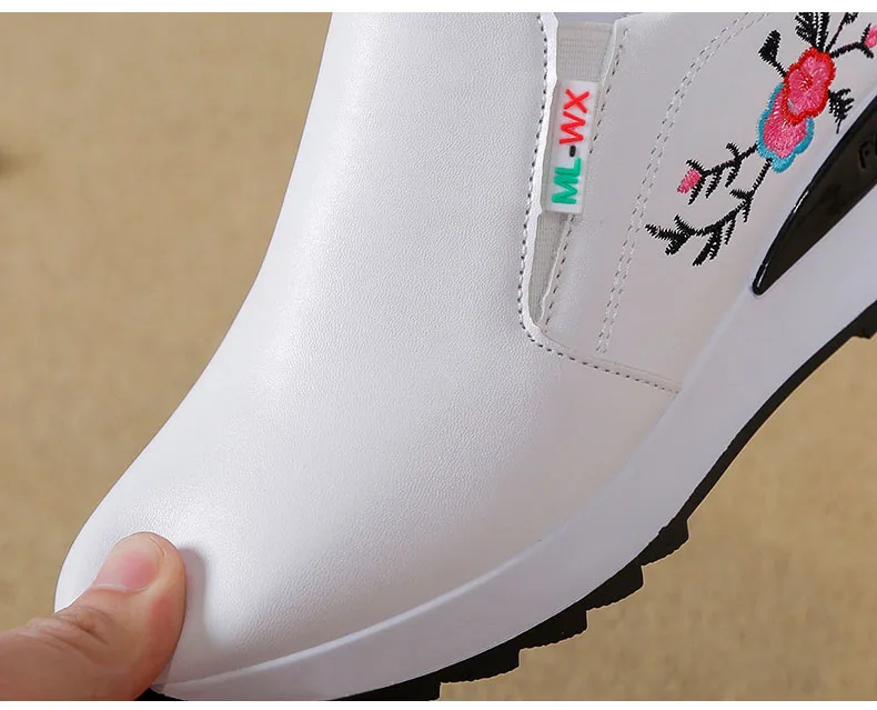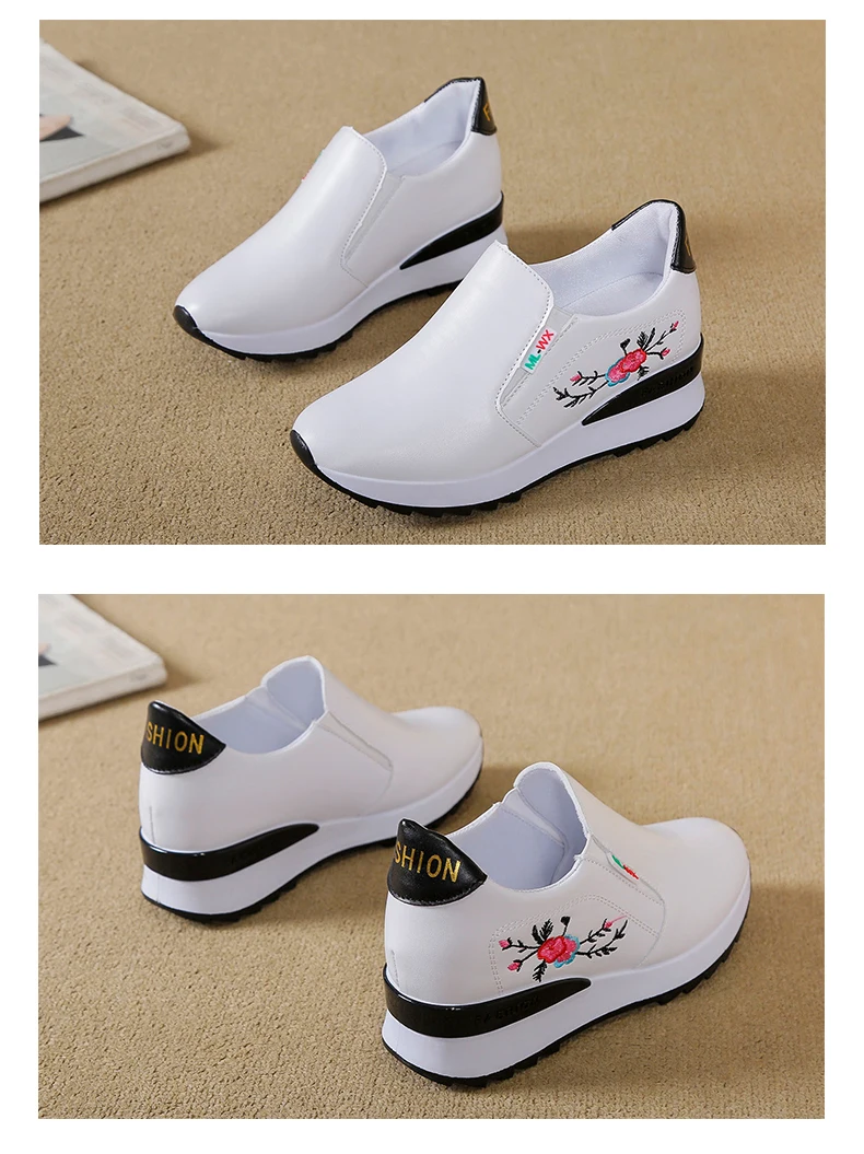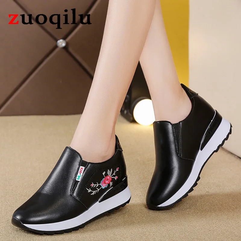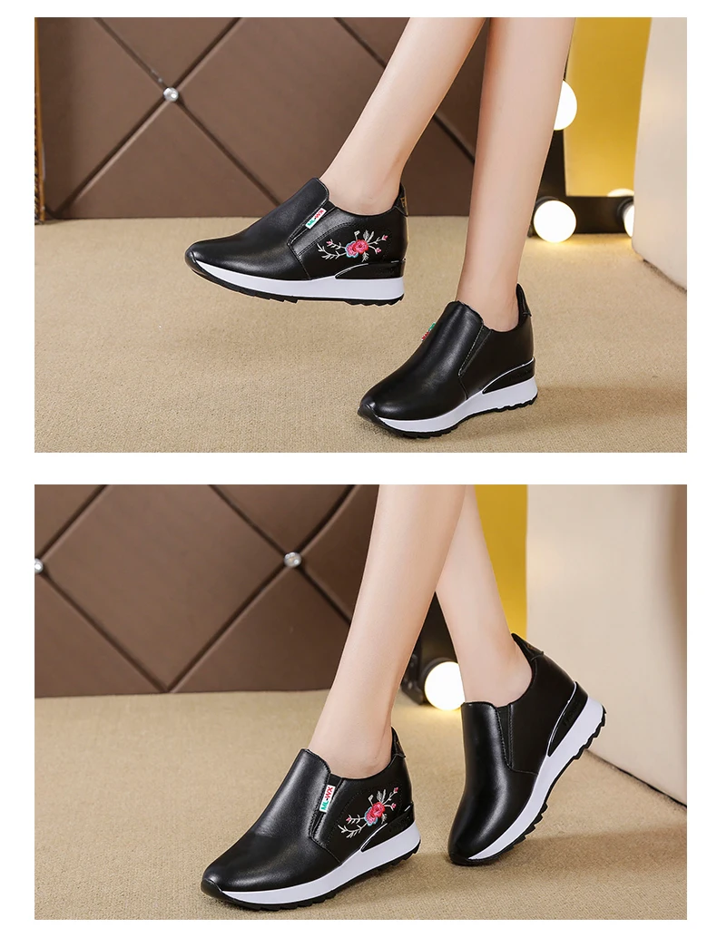 Модные кожаные туфли на платформе с цветочной вышивкой; Женская повседневная обувь на танкетке; Обувь на платформе