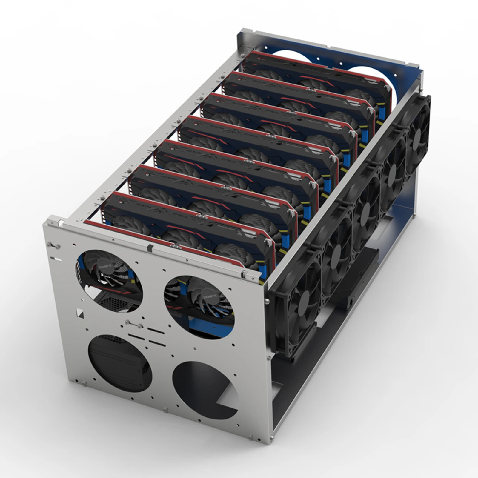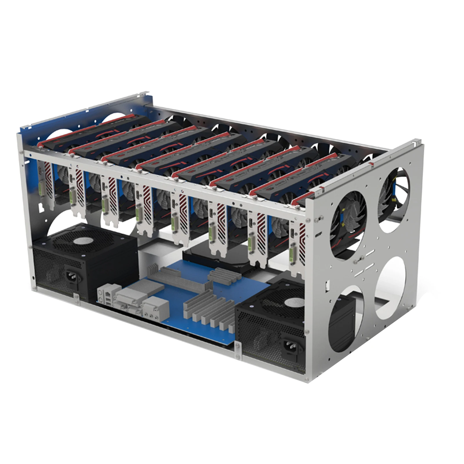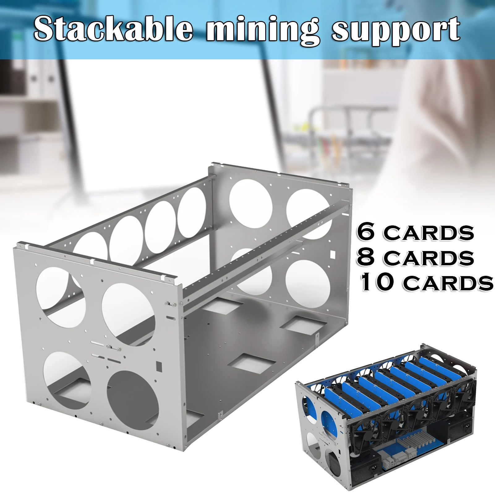 1. Этот продукт представляет собой Графический держатель для карт из листового металла с ЧПУ, который может быть сложен.2. Простота установки и прочная конструкция.Поддержка двойного источника питания.3. Разработан в соответствии со стандартными отверстиями материнских плат, видеокарт, жестких дисков и источников питания.4. Продукт является пустой полкой без вентиляторов, выключателей и ламп.5. Расстояние между 6 видеокартами 10 см, 8 графических карт 8 см, 10 видеокарт 6 см.