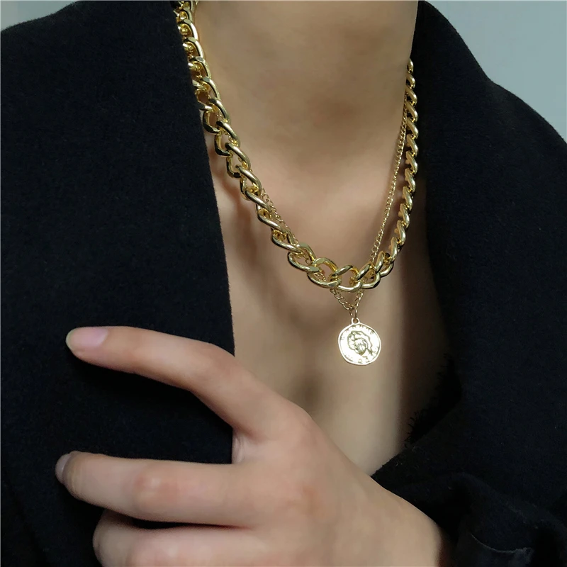 Женская толстая цепочка с подвеской-монеткой, ожерелье золотого цве...