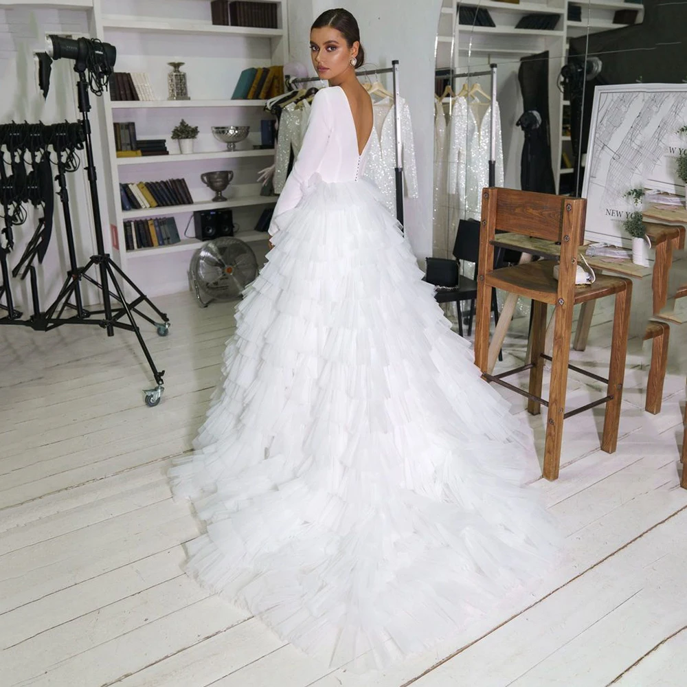 UZN Белое Бальное Платье, Свадебное платье с круглым вырезом из атласа с длинным рукавом и фатиновой юбкой для невесты, юбка с оборками, платье для невесты на заказ