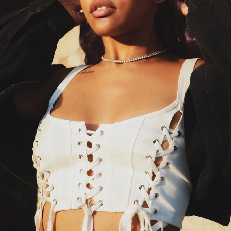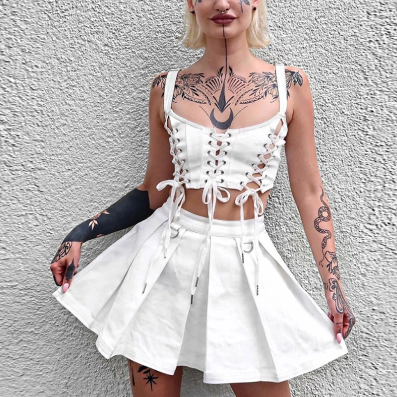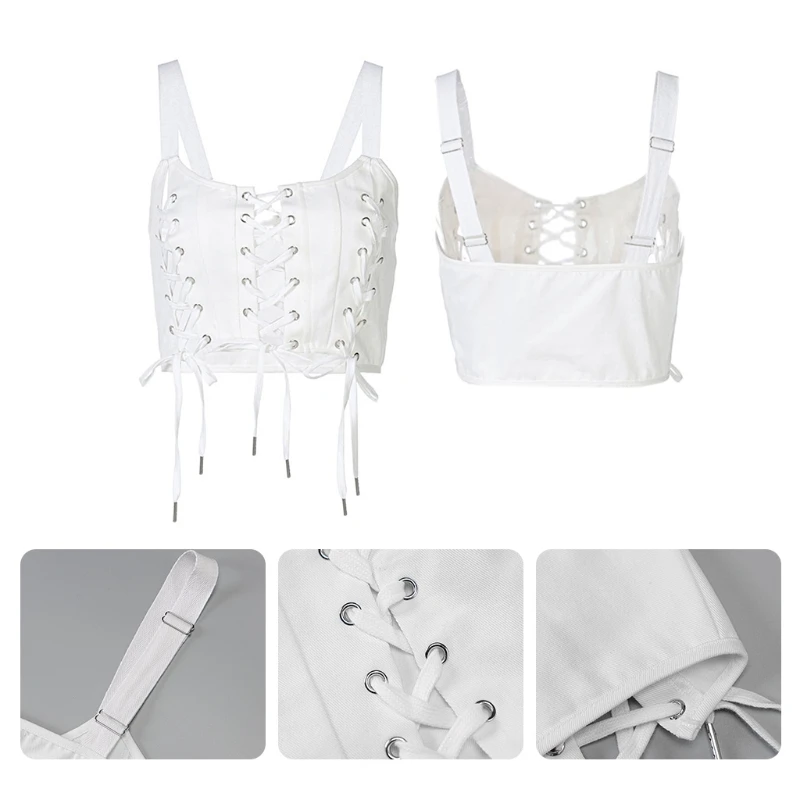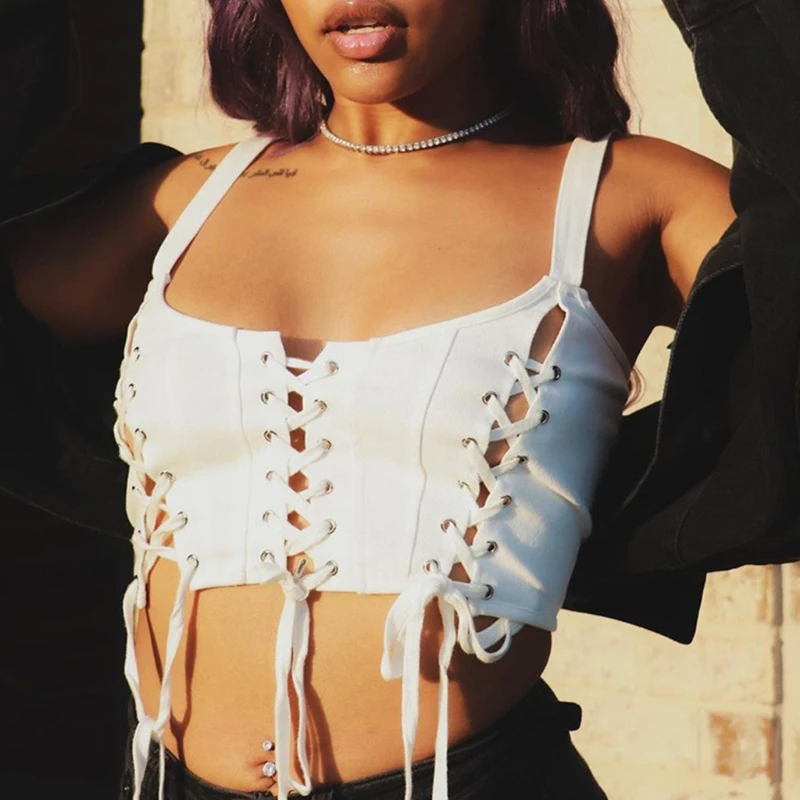 Женский Готический укороченный топ без рукавов в стиле панк, белый пикантный топ с квадратным вырезом, ажурный корсет с перекрестными шнуровками, облегающий жилет